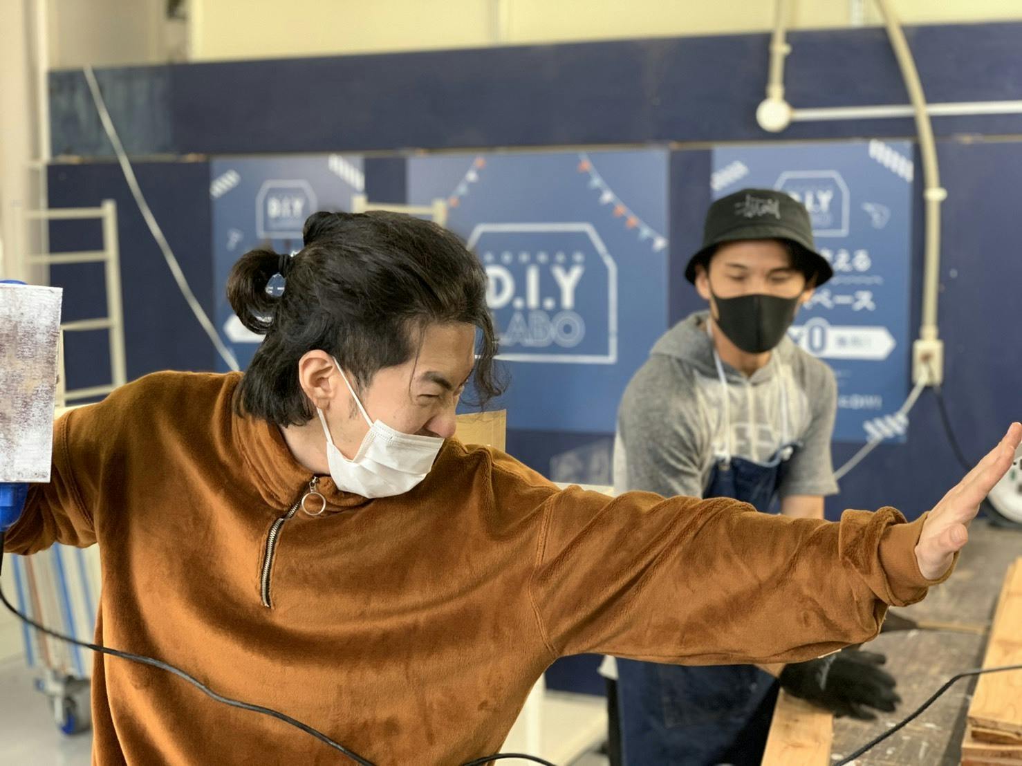 今は、木を切って、研磨して、塗料を塗って天井や壁に貼り付ける作業をしております。