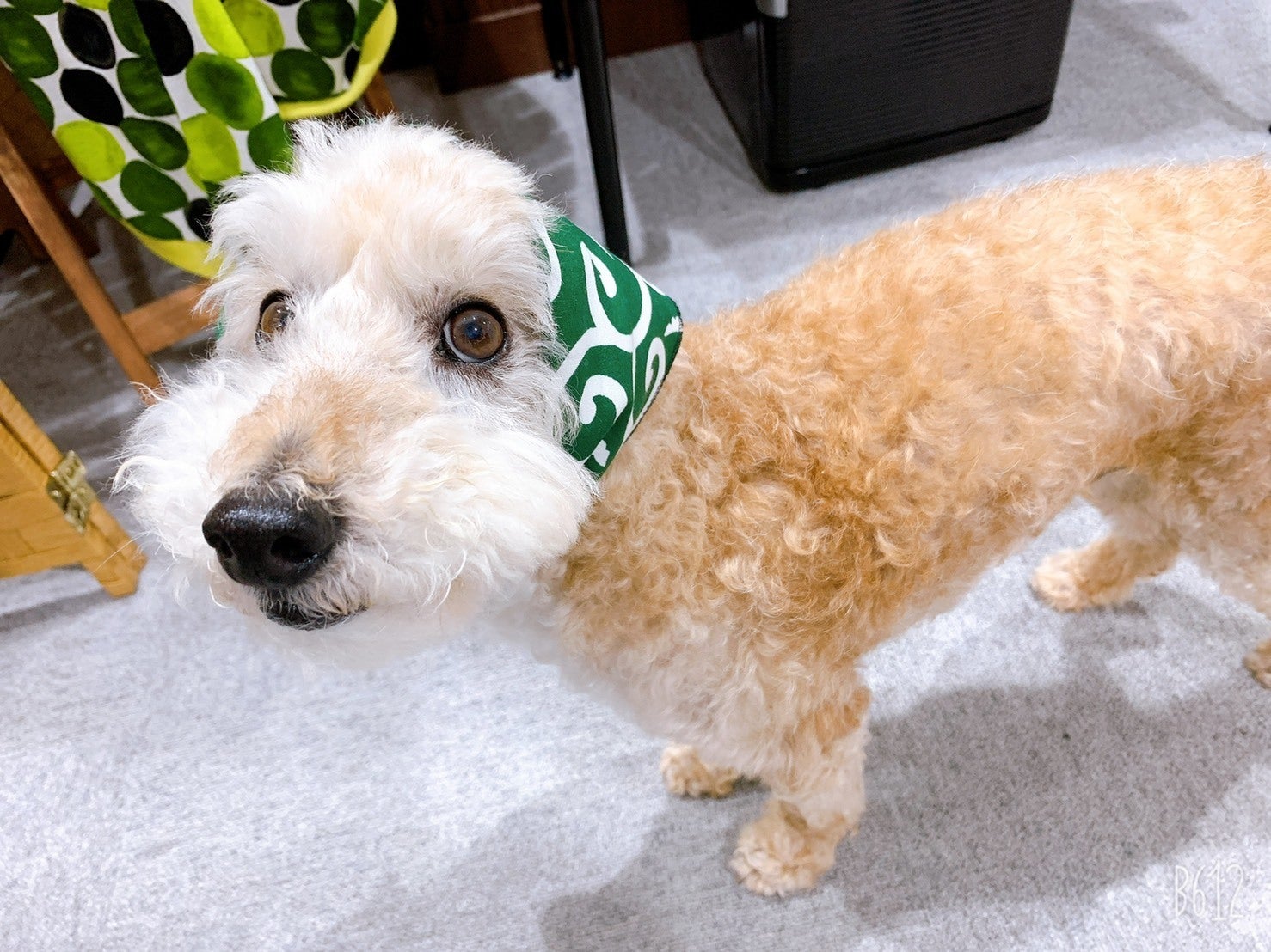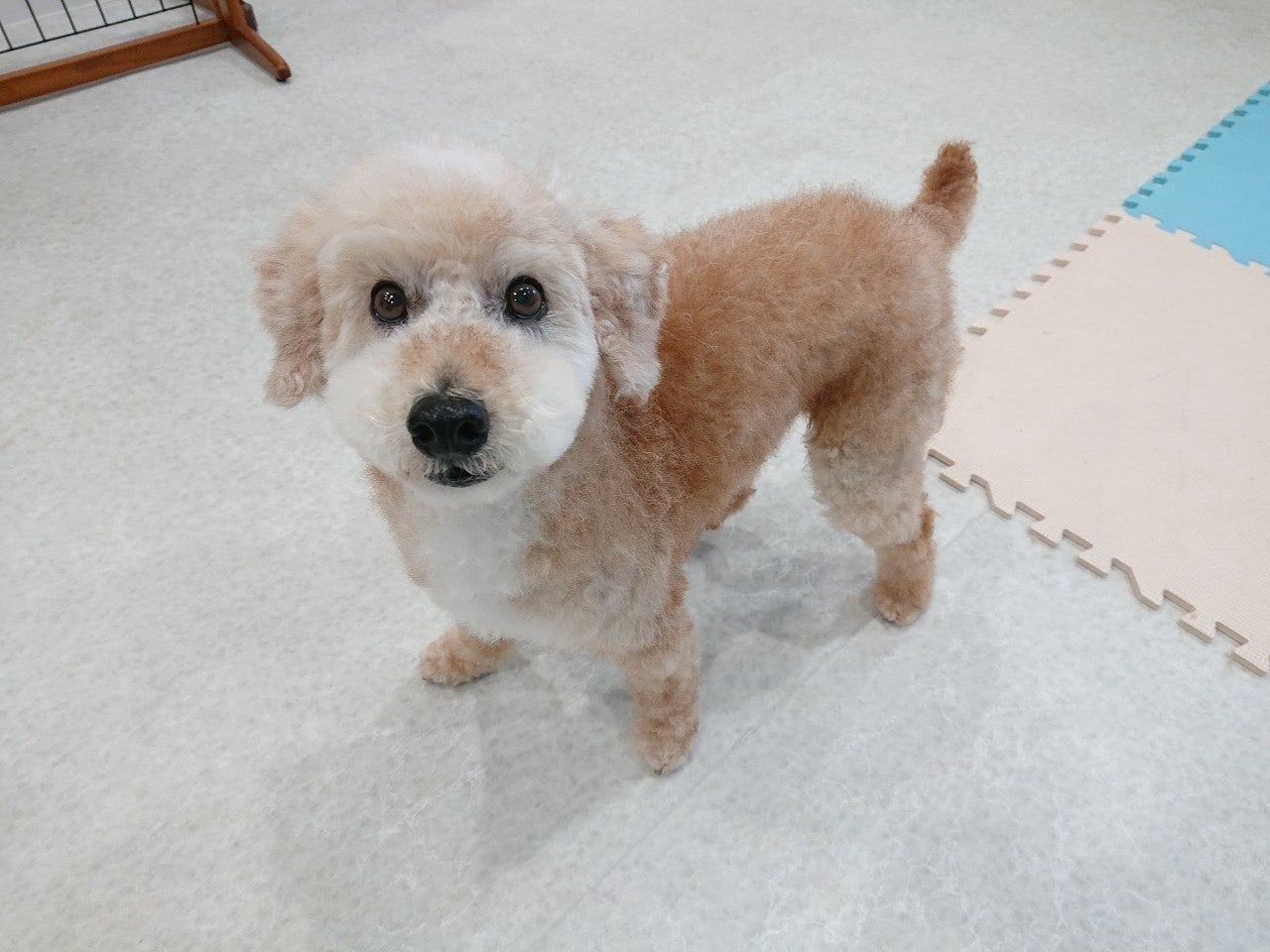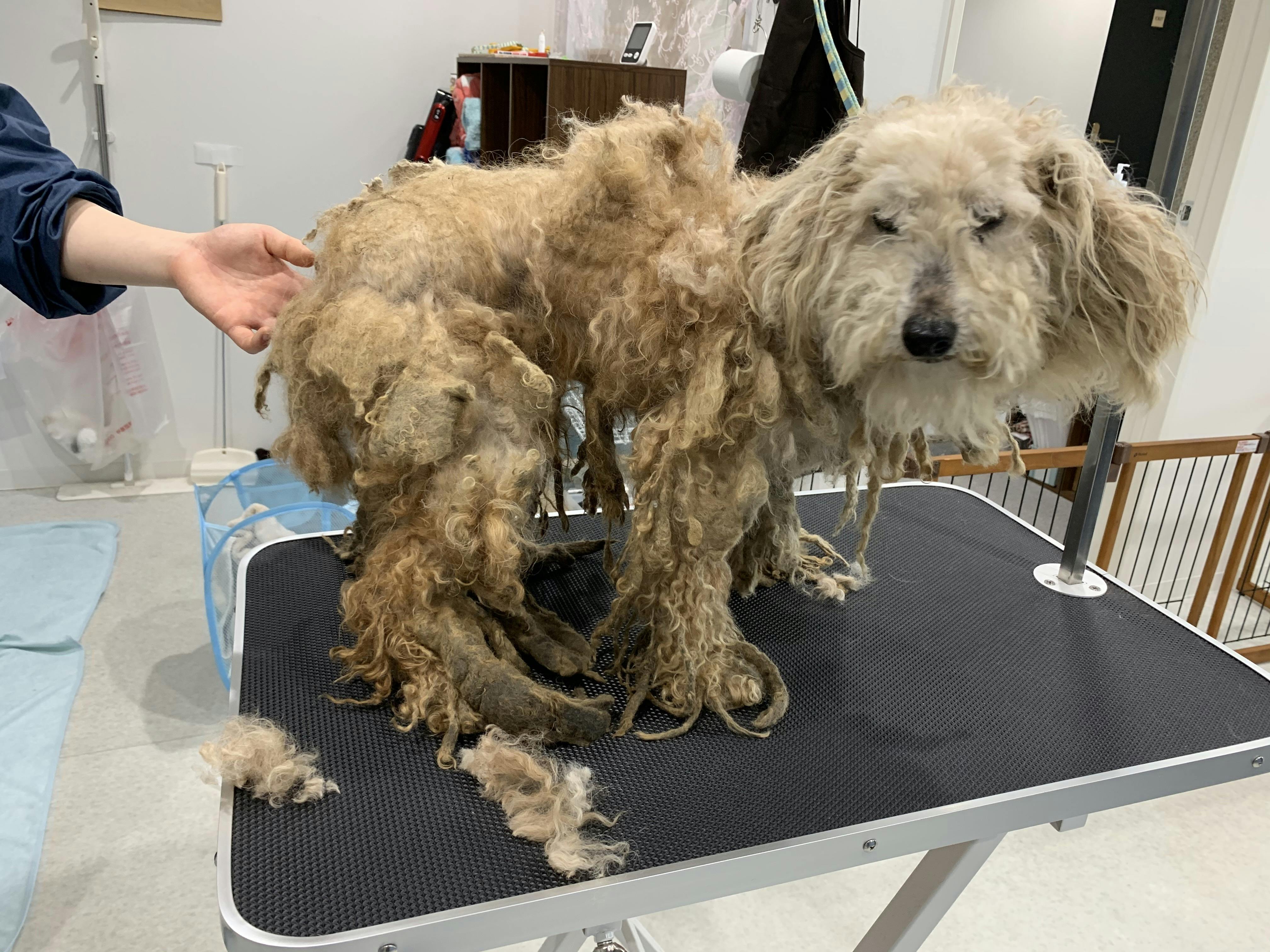 保護してから大きなカチカチの毛を刈ると、体はガリガリでした。ですが、今は徐々に体つきも良くなり、毛もふわふわになり、看板犬として過ごしています。