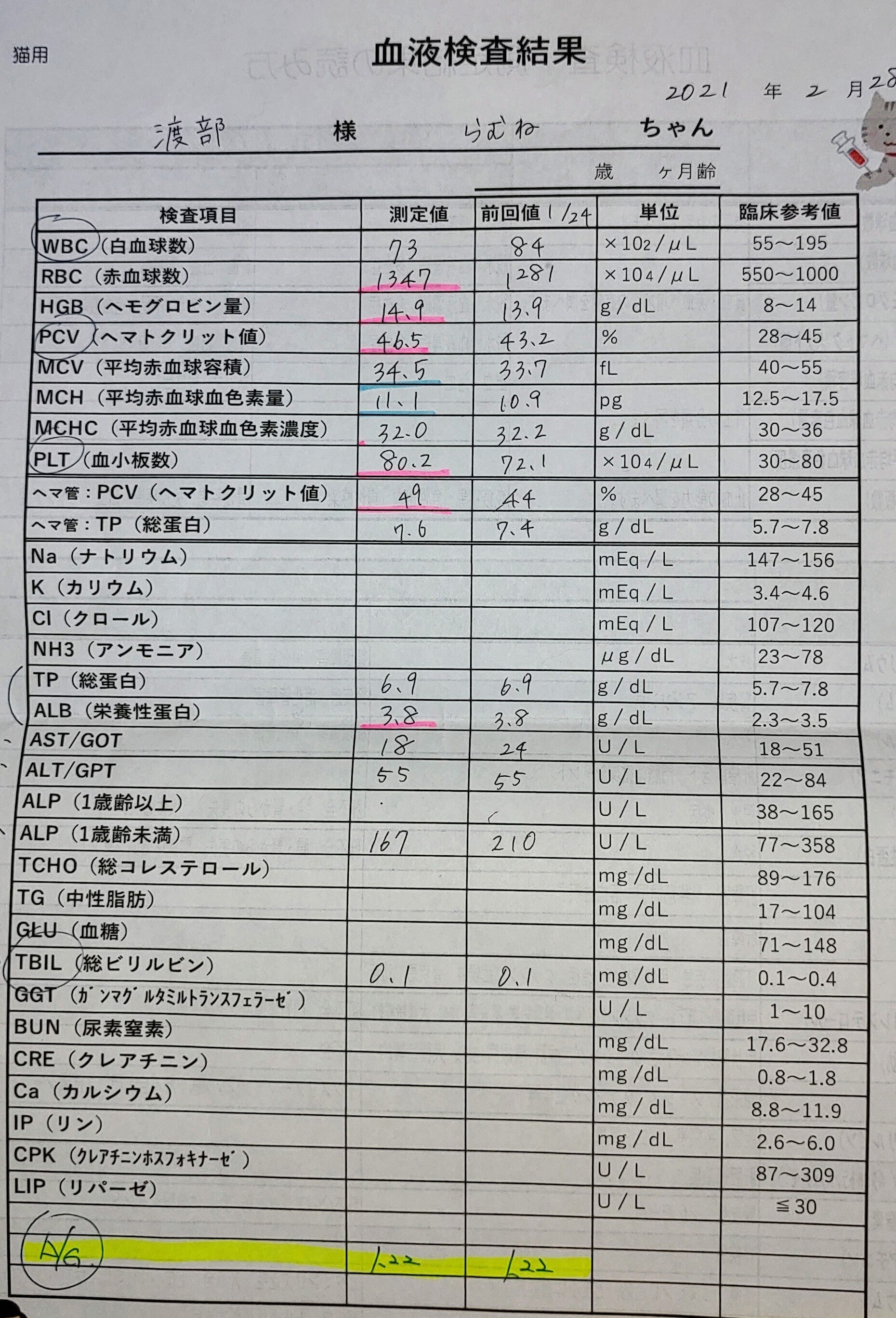 貧血に関わる赤血球値(RBC HGB PCV)も問題なし。体内の炎症の有無がわかる白血球値(WBC)もクリア。