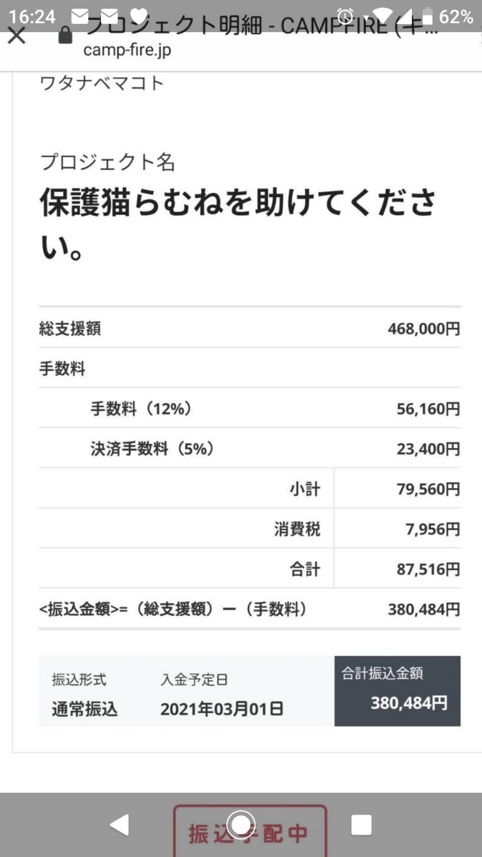 17%の手数料を引いた ¥380,484 が振り込まれておりました。