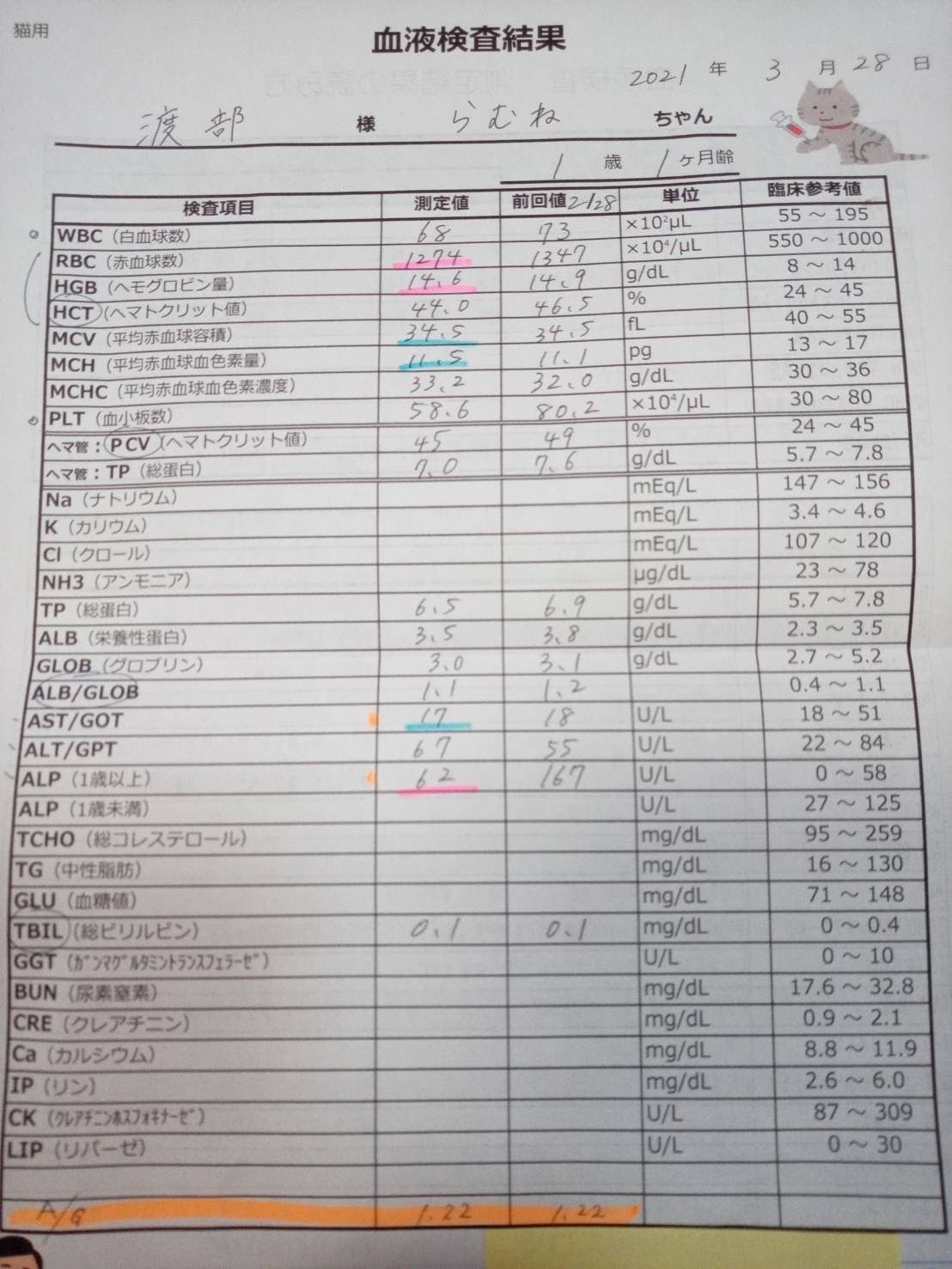貧血に関わる赤血球値(RBC HGB PCV)も問題なし。若干高めではあるけれど毎月下がってきていて心配いらないとのことでした。