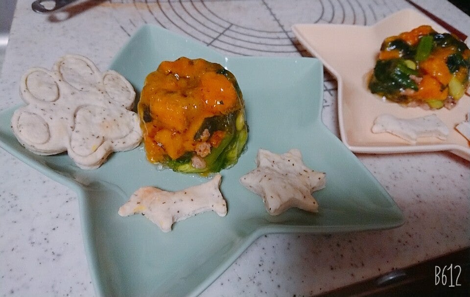 ゼラチンで固めたら崩れてしまいました;かぼちゃ、ほうれん草、枝豆、ひき肉次はもっとうまく作ります!!