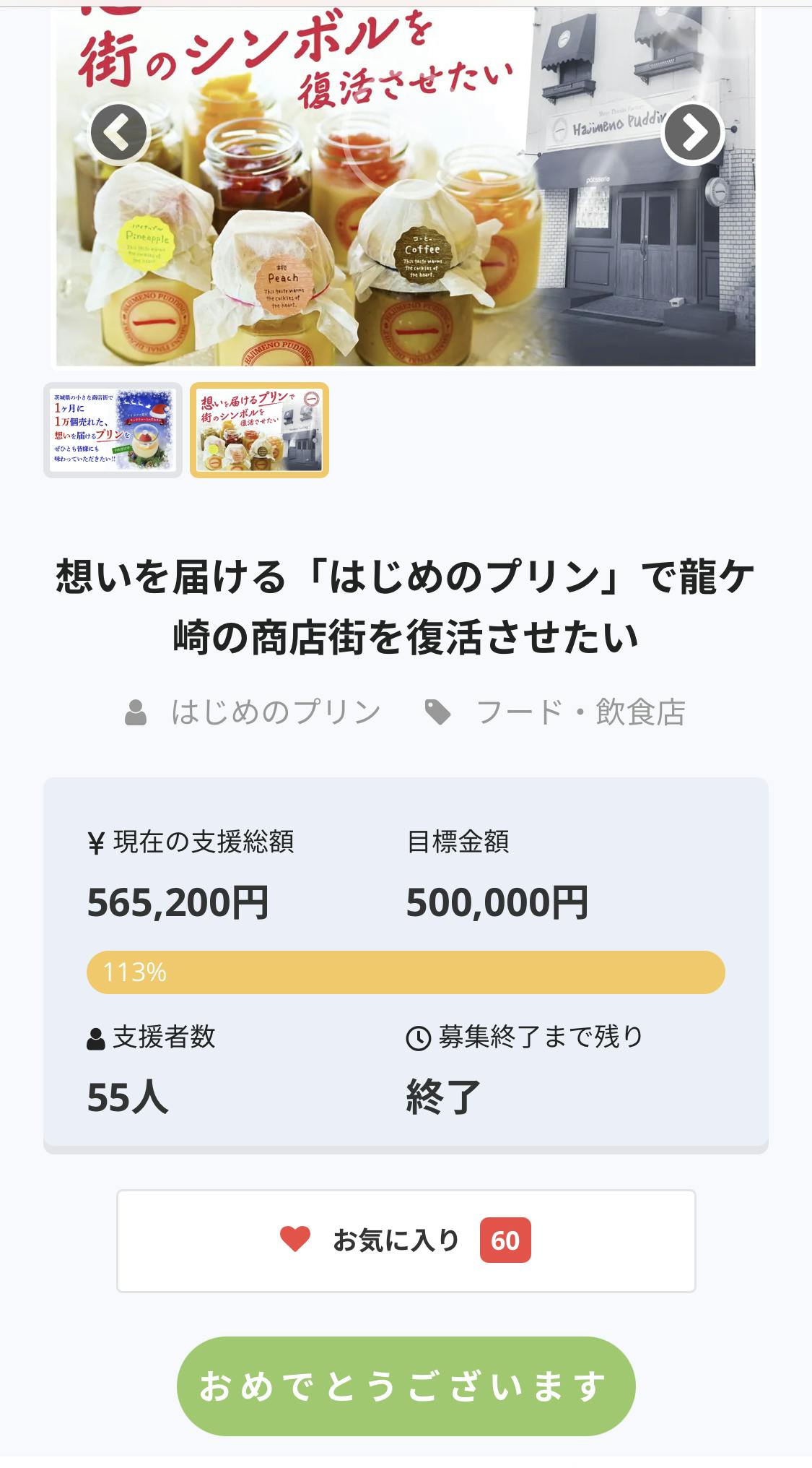 • 皆様ありがとうございます!本日、仕出しの最後の追い込みでバタバタしておりますして、ご支援いただきました方々のお一人お一人の確認は後ほどきちんと確認致させて頂きます!先ずは、このプロジェクトに関わって頂きました全ての皆様に感謝です!ありがとうございました!順次リターンを進めて参りますので、もう少しお待ちください!皆様の温かいご支援を胸に、龍ケ崎市を盛り上げ、賑やかな商店街を復活させていきたいと思います!次は日本一のプリンを目指します!   はじめのプリン  酒井はじめ もっと見る