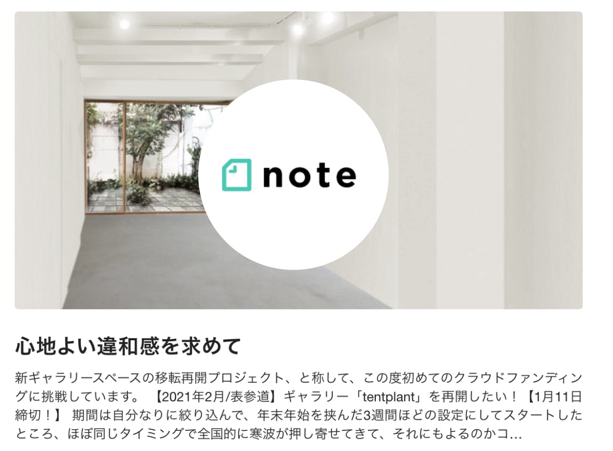 2021/01/09 12:01https://note.com/masaakitakahashi/n/n699c5ef318ac↑↑note更新しました↑↑クラウドファンディング期間も残すところ【あと2日!】となりました。ラストスパートを迎えて皆様からの暖かい支援を頂いています。また沢山のメッセージも頂き、とても励みになっております。リターンに利用券を設定させていただいたのも、このクラファンを通じてもっともっと私たちのスペースづくりや運営しながら考えていることを知ってもらいたいという気持ちがありました。記事の方には書ききれなかった、新しいスペースに対する想いや、今後色々と試みてみたいことの一部をnoteに書いてみましたので、クラウドファンディングでご紹介している記事と併せて読んでいただけると、とても嬉しく思います。こんなことやってみれば?という丸投げ企画や、こんなことやりたいんだけど?という持ち込み企画、その他、ご意見も歓迎です。noteも定期的な配信として、やや個人的な感じではありますが続けていこうと思いますので、引き続き応援よろしくお願い致します。tentplant代表 高橋 もっと見る