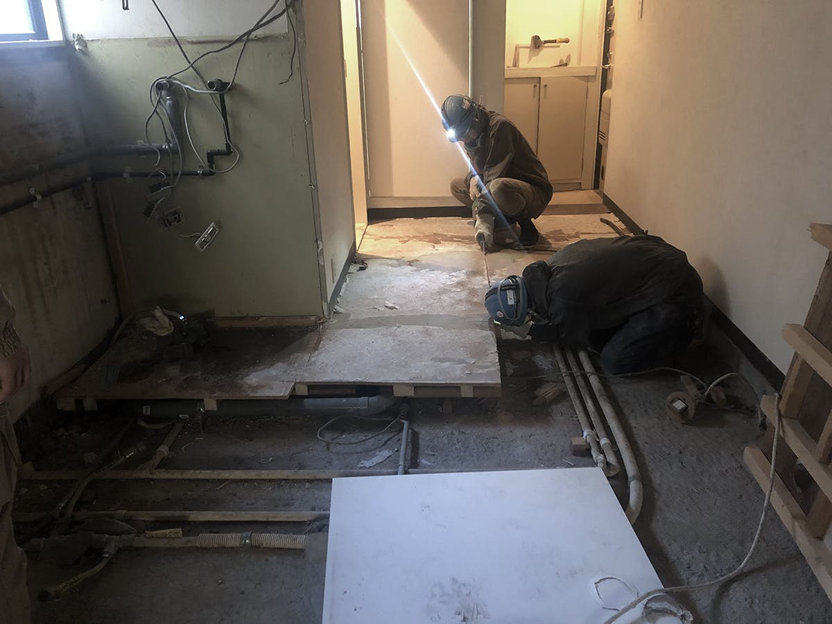 古い建物のフルリノベーションでよくある話ですが、床の下の配管はどこにどういうルートで流れているかは開けてみないとわかりません。いくつか想定外の配管はありましたが、柔軟に対応頂けるいつもの監督や職人さんと打合せをして、新規ルートを検討します。