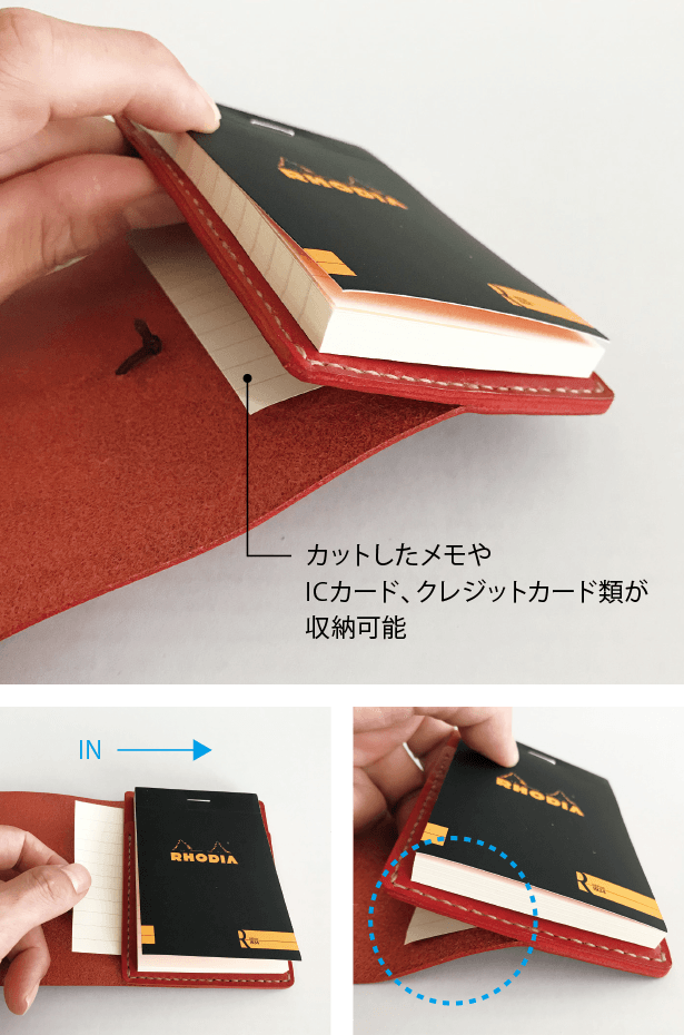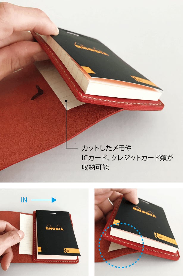 メモ帳を挟み込んだ下にスペースを設けてあり、残しておきたいメモを収納できます。Suica等のICカードやクレジットカードを収納する事もできます。