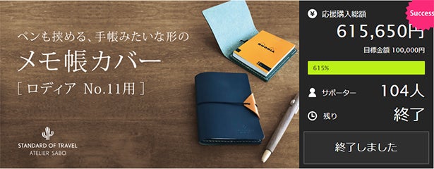 今回のプロジェクトはMakuakeクラウドファンディング にて104人の方にご購入いただいた 「ペンも挟める、手帳みたいな形のメモ帳カバー[ロディア No.11用]」です。