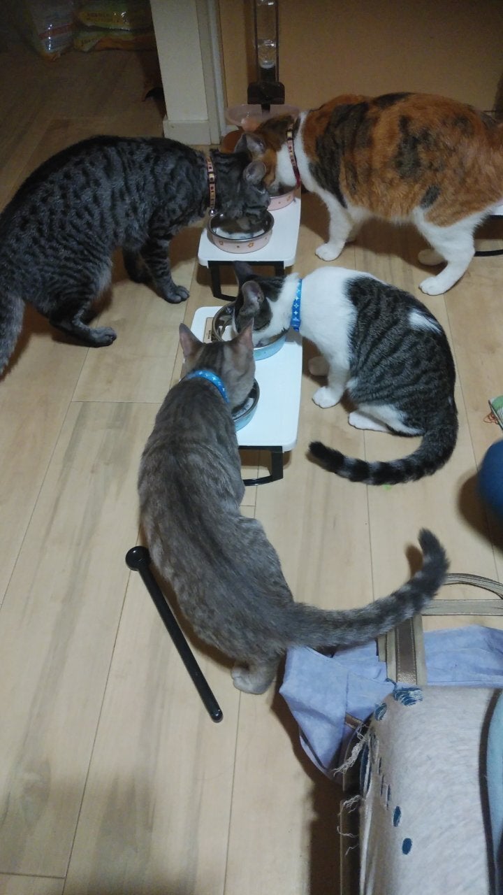 主人、私、娘、こはく(三毛)みく(サバとら)がぶ(むぎとら)とわ(はちわれ)の3人4匹家族です。