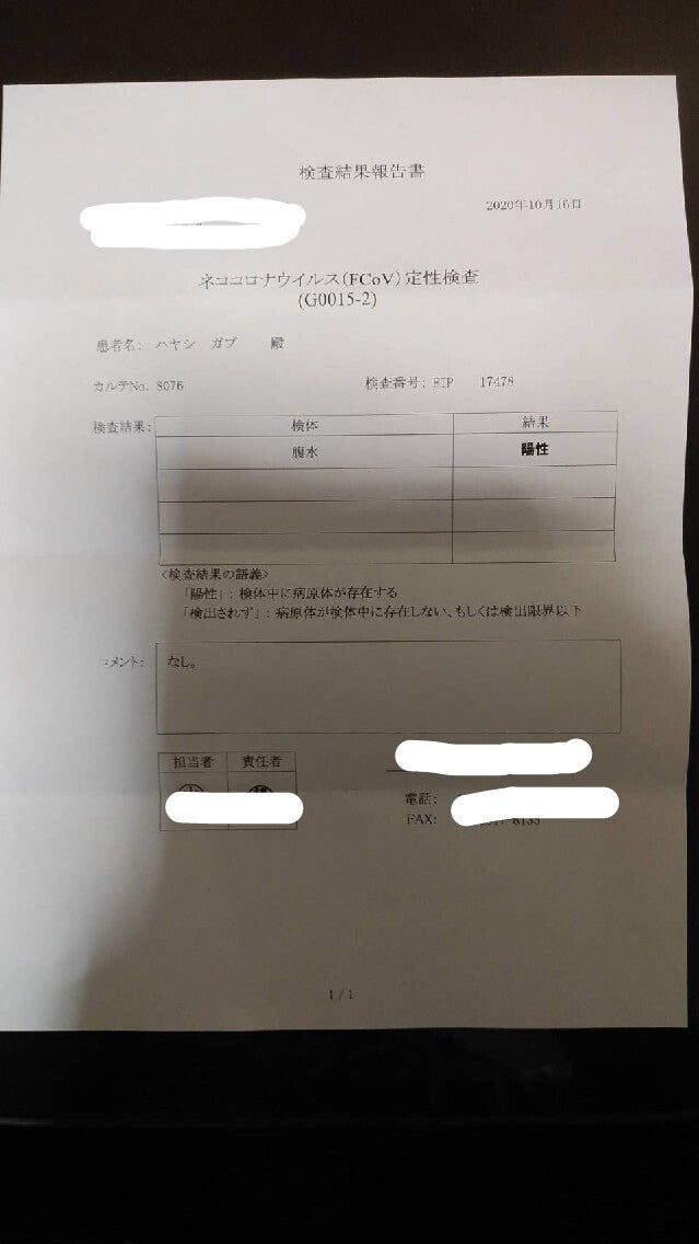 かかりつけの獣医さんからの連絡で先日の検査の結果が出たことを聞きました。猫FIP陽性