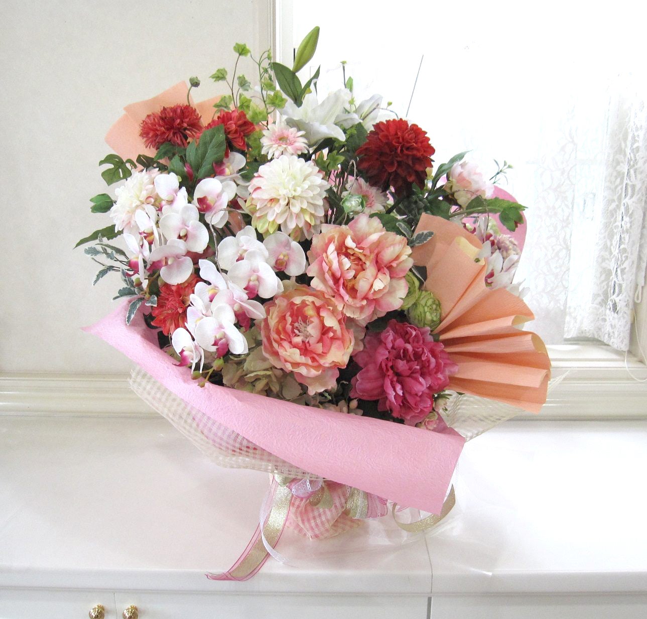 材料はプリザーブドフラワーを始め、播州織等で制作したアーティフィシャルフラワーや自身で制作したアンティークフラワーが入ります。