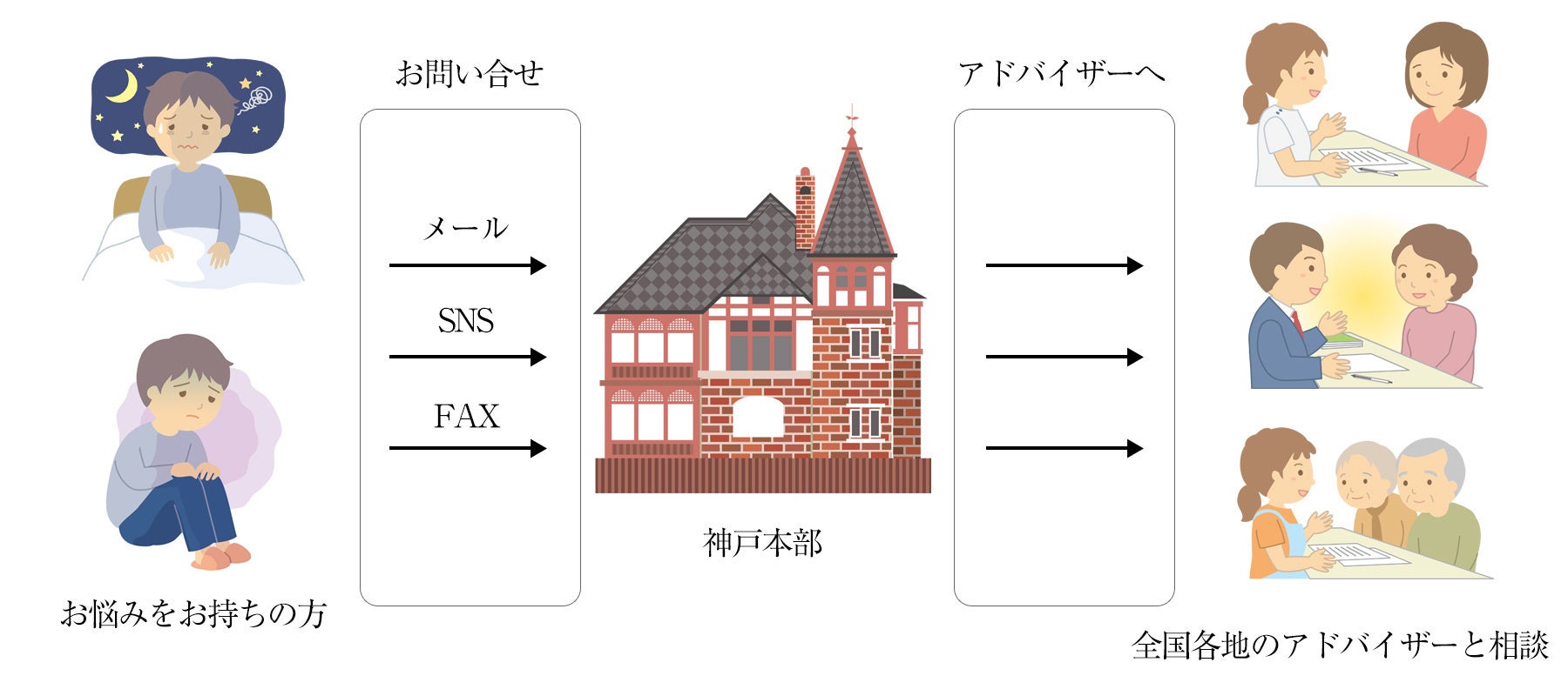 まず相談者様から拠点となる本部(神戸本部)へメール、SNS、FAXにてご連絡をいただき、相談者様よりチェックシートを頂くようにします。(折り返しチェックシートを頂いた方のご相談をお伺いするようにいたします。)