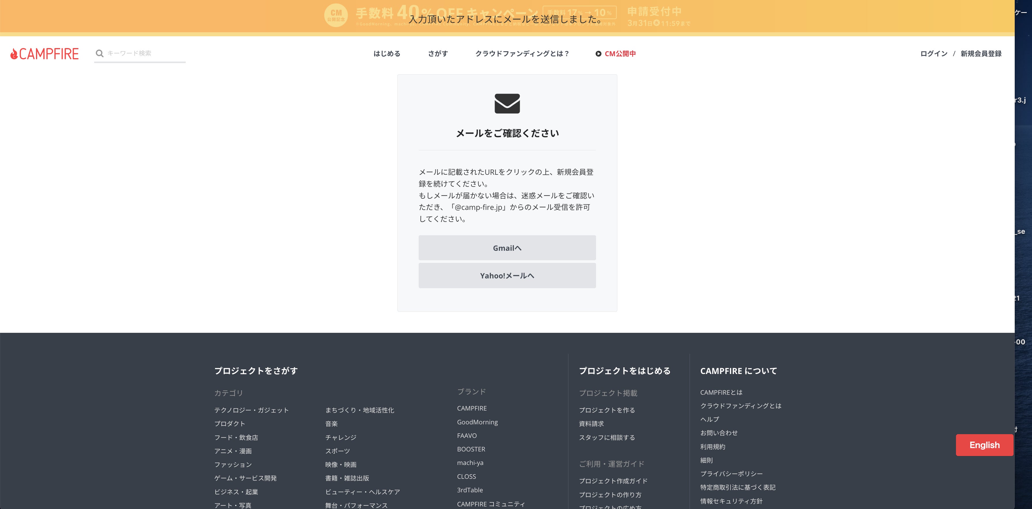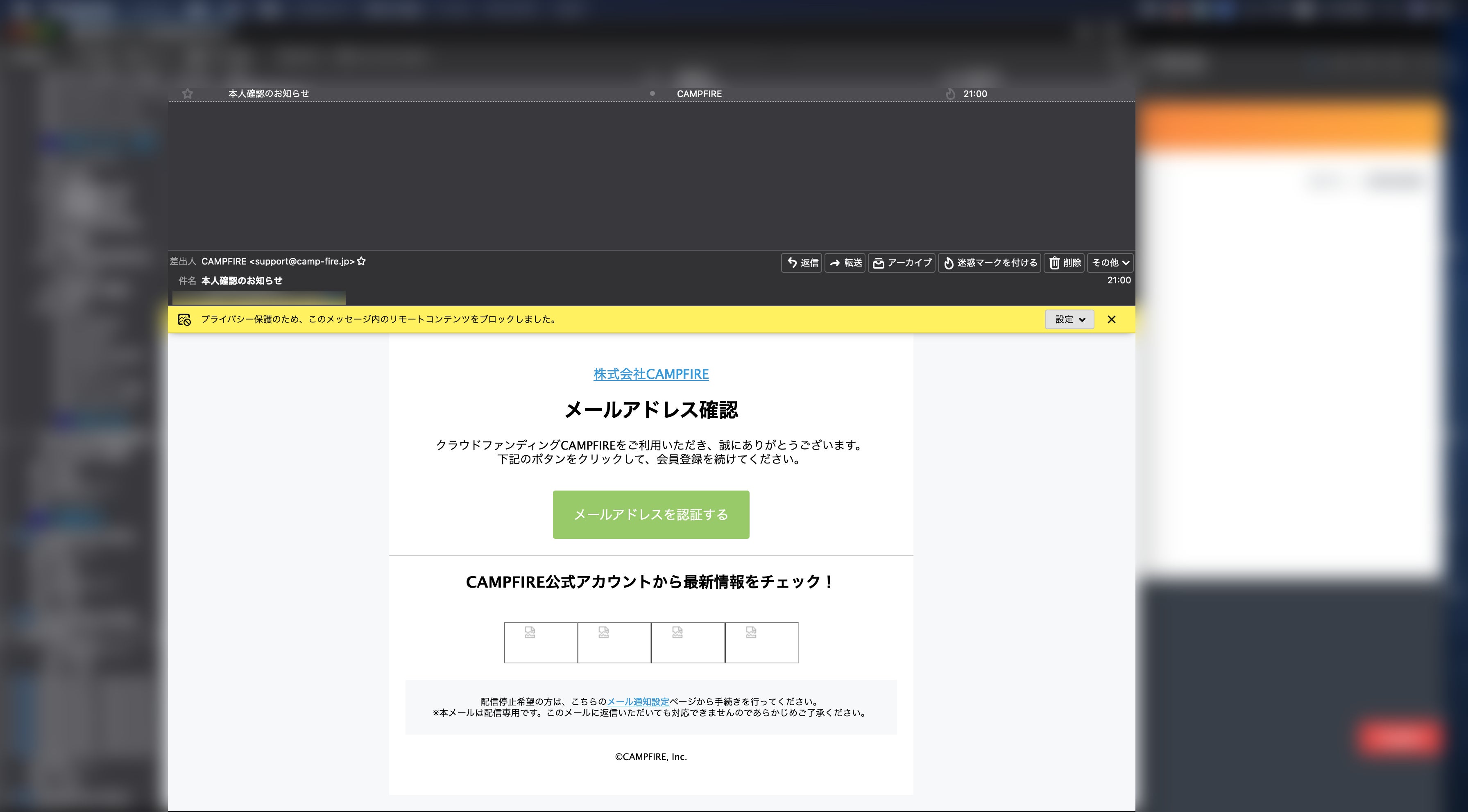 CAMPFIREからメールアドレスの確認メールが届いていますので、