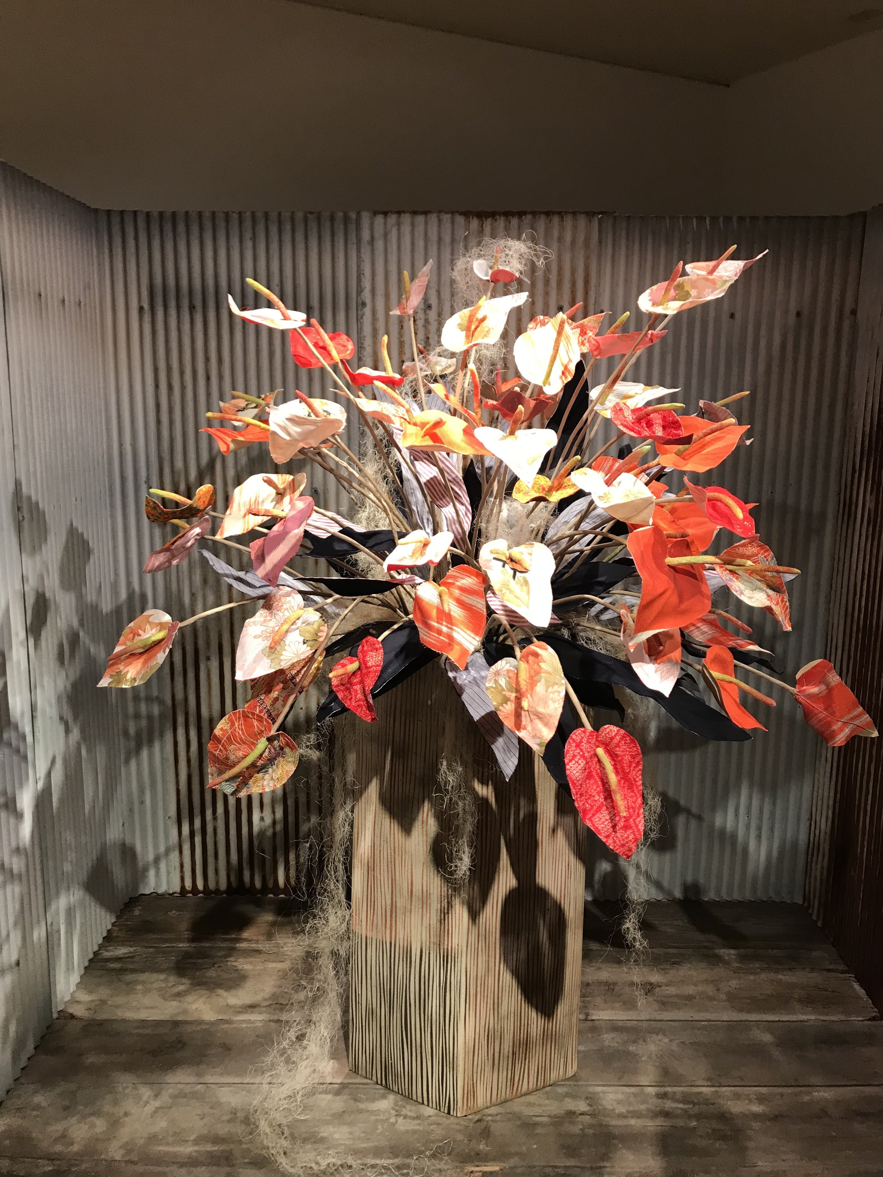 沢山のアンスリュウムを市野先生の壺を生かす様に入れさせていただきましたが、いかがでしょうか?