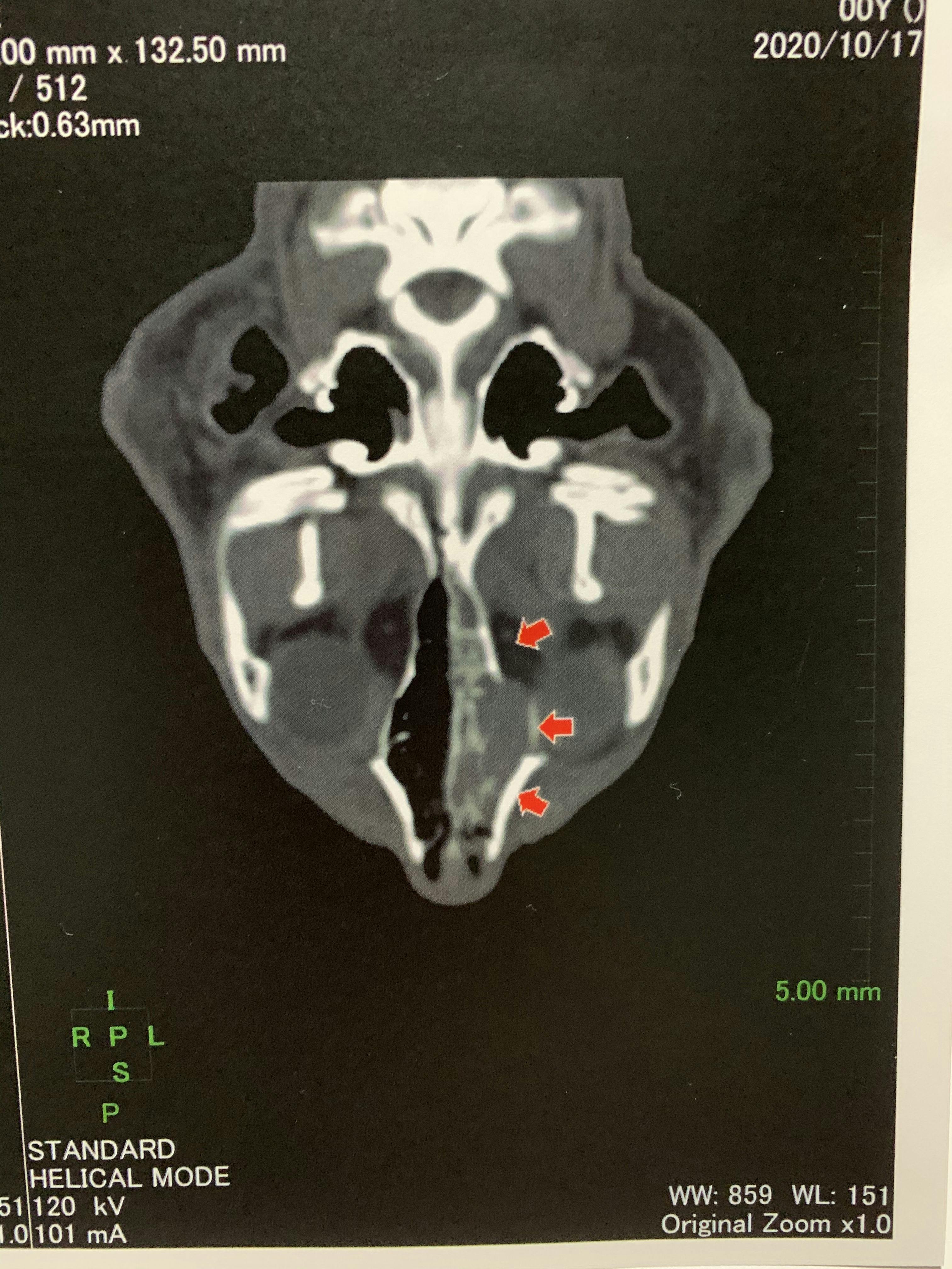 腫瘍が左目の骨を圧迫していて骨を壊しかけており、症状が進んでいくと左眼球突出してくる。
