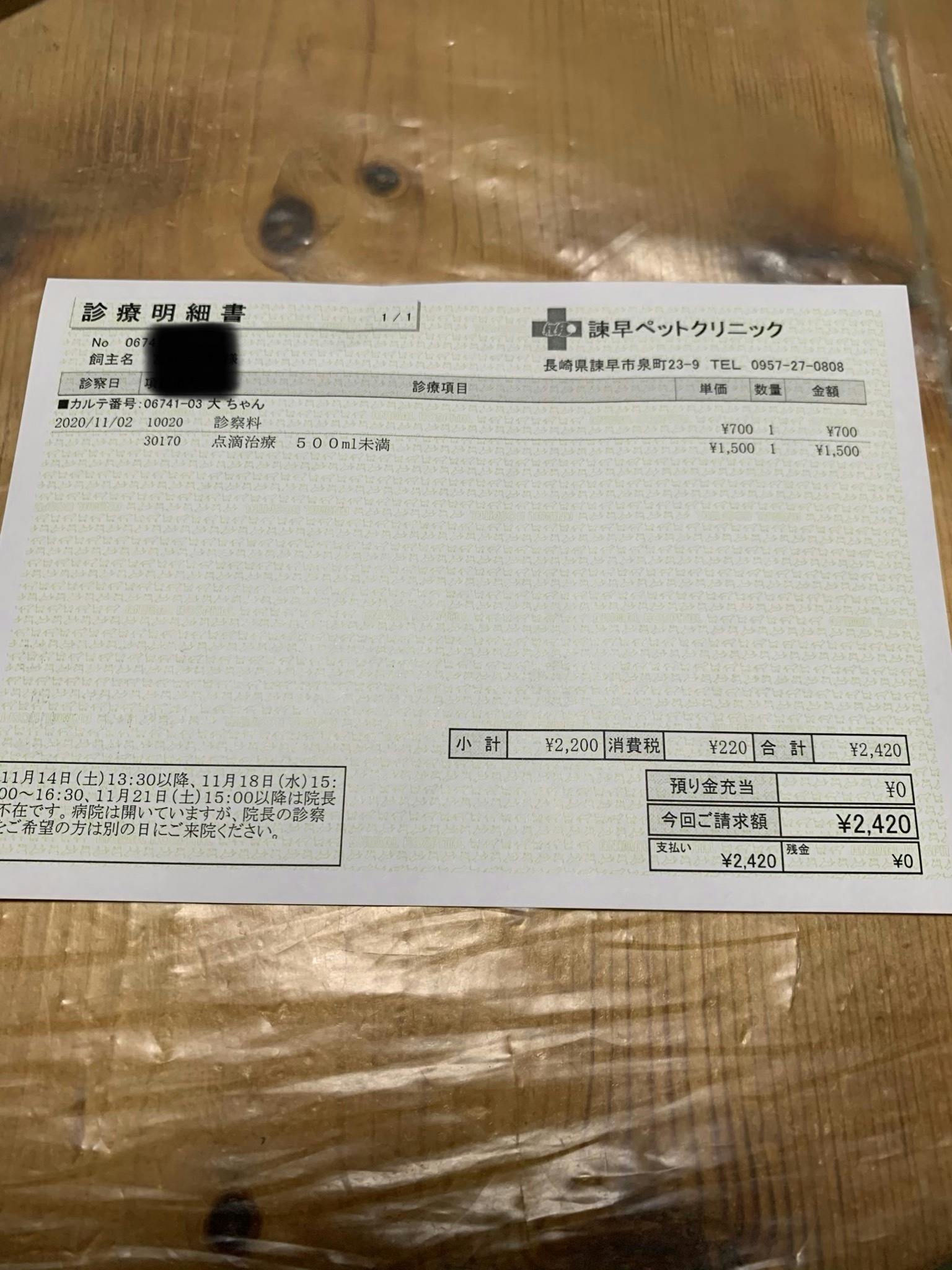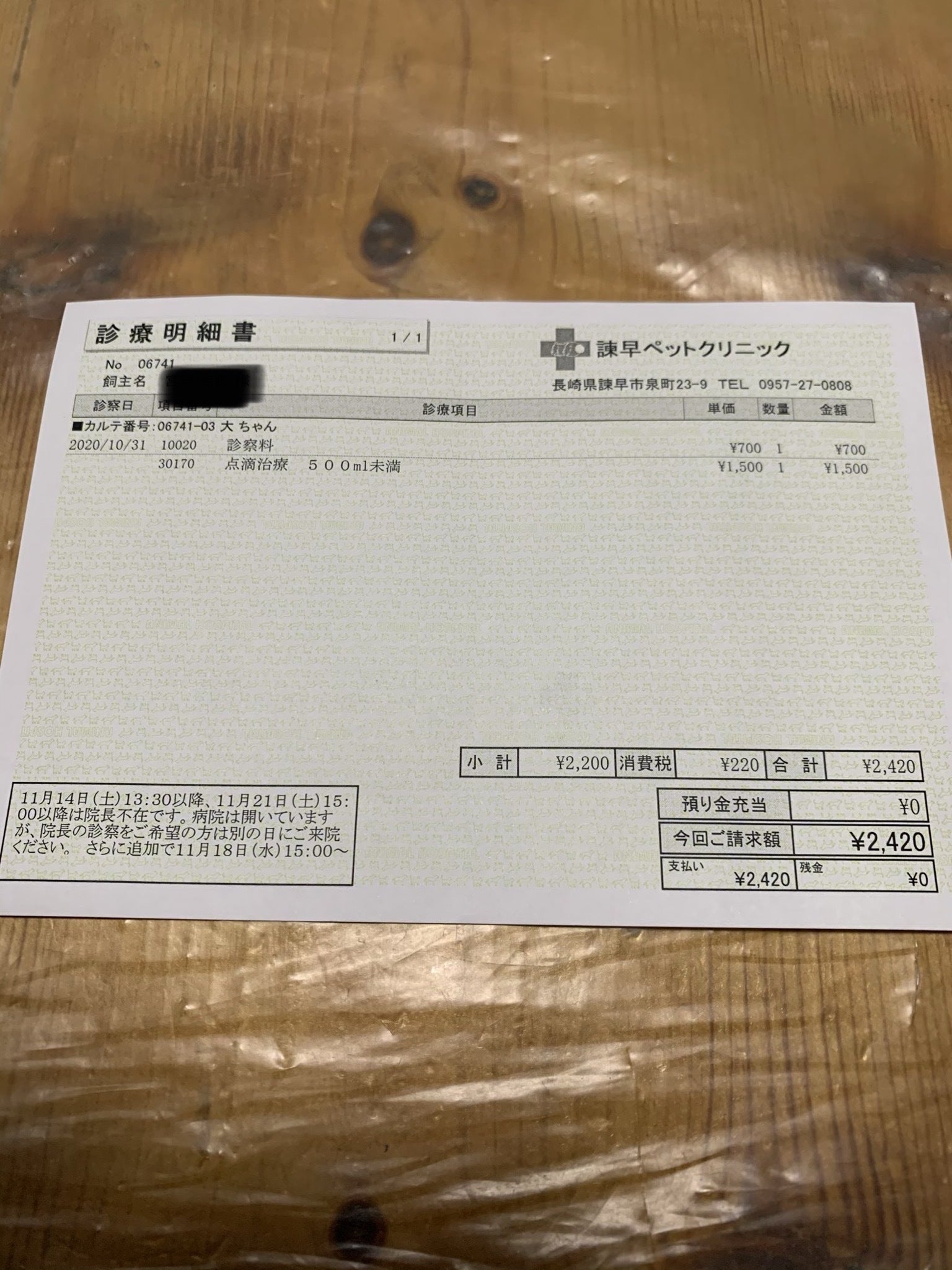 腎不全の点滴 1回1500円(抗がん剤使用時、そのほか1日おき)