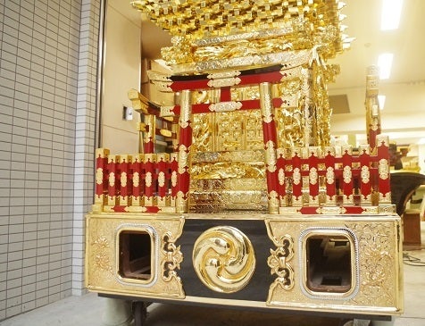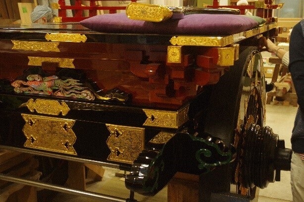 いまは神輿の屋根、本体、牛車。大きく3つにわかれており、修復の済んだ部品を組み上げています。