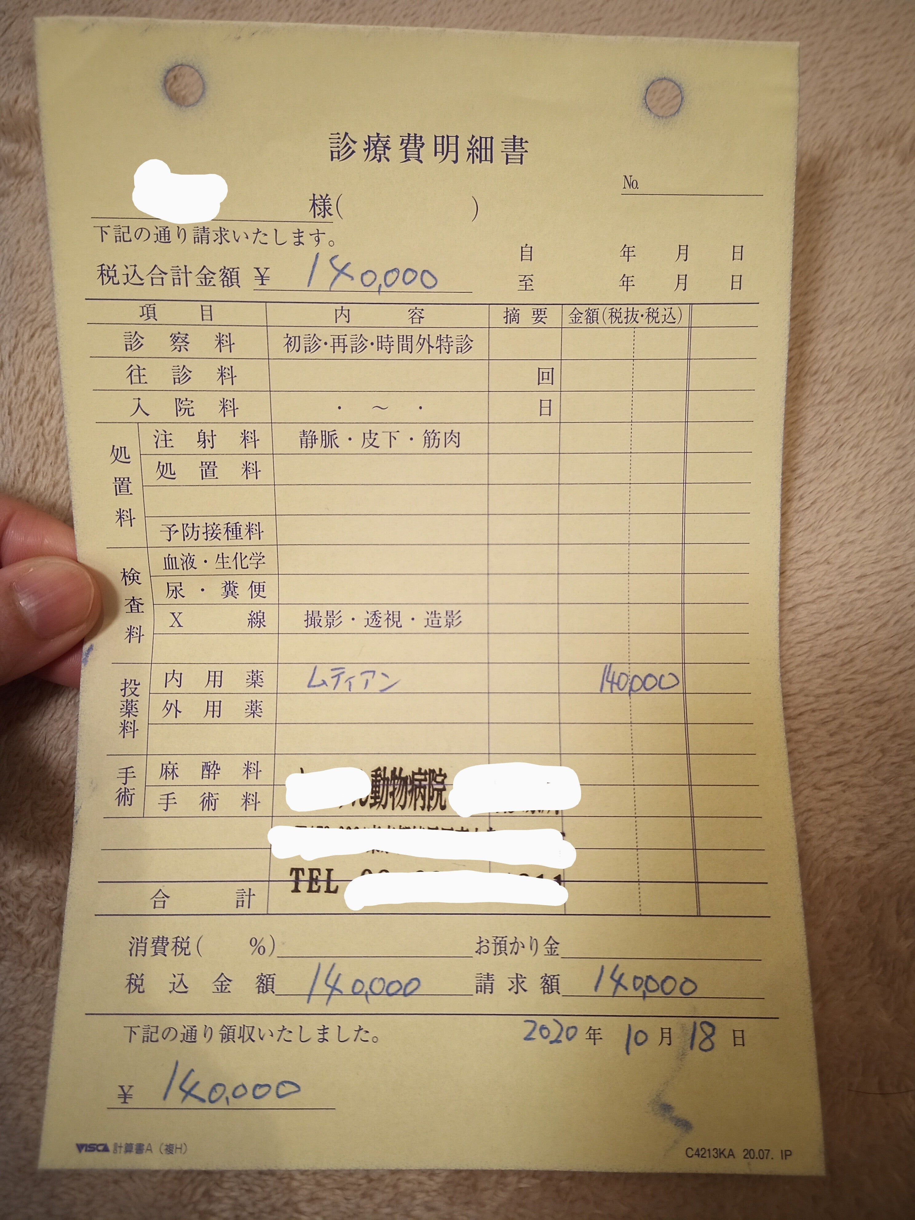 国内でその未承認薬の治療ができるのは、数施設の協力病院と個人輸入をしているごく一部の動物病院のみです。また、この薬剤費が非常に高くペット保険も適用外であるため、飼い主(私含む)の大きな負担となっています。薬の存在を知っても、高額すぎる故に治療を諦めざるを得ない飼い主がいることも事実です。