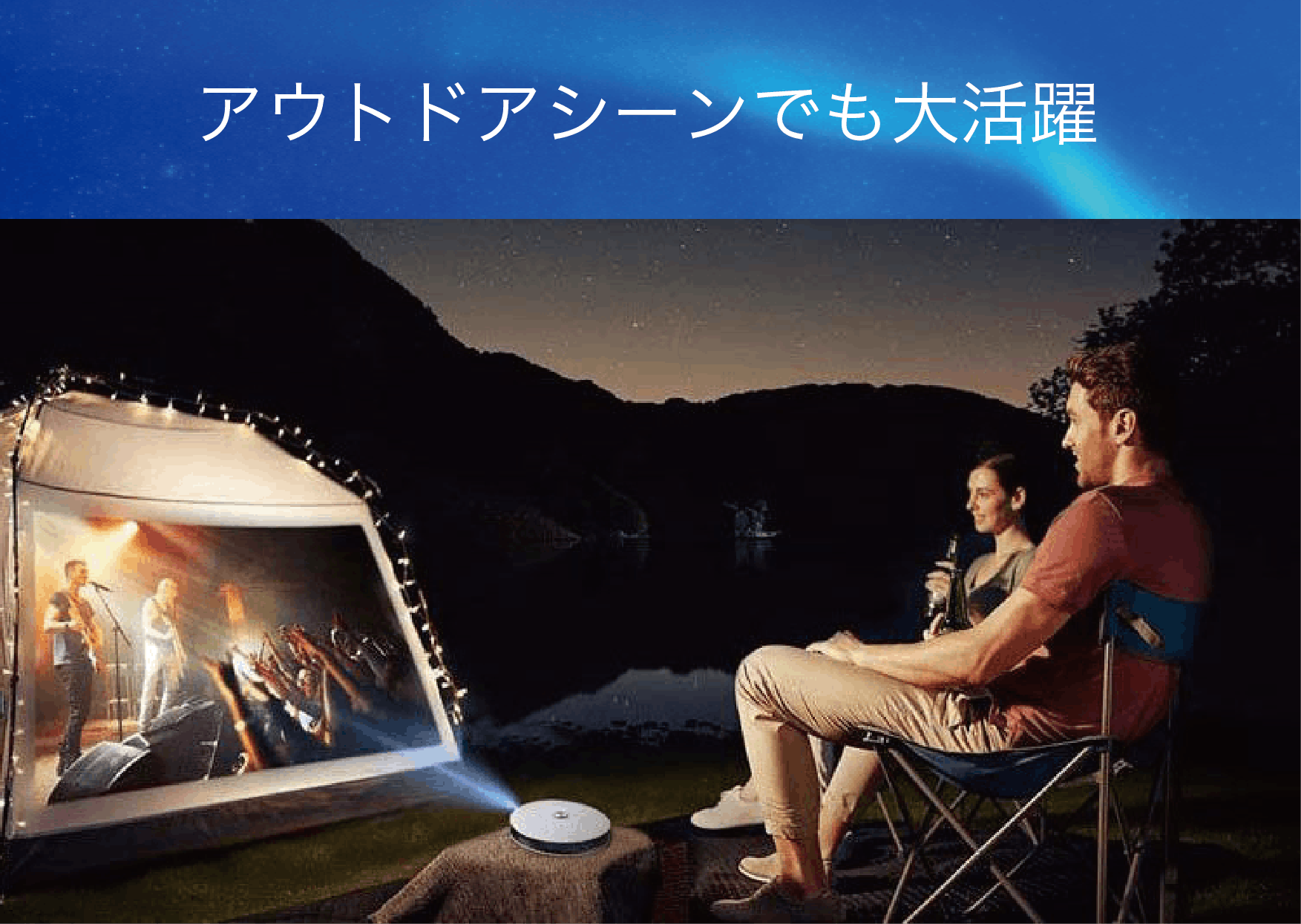 5000ルーメンの明るさと3Wのデュアル・スピーカー内臓により、アウトドアシーンでも夜空の下などで好きな映画を楽しむことができます。