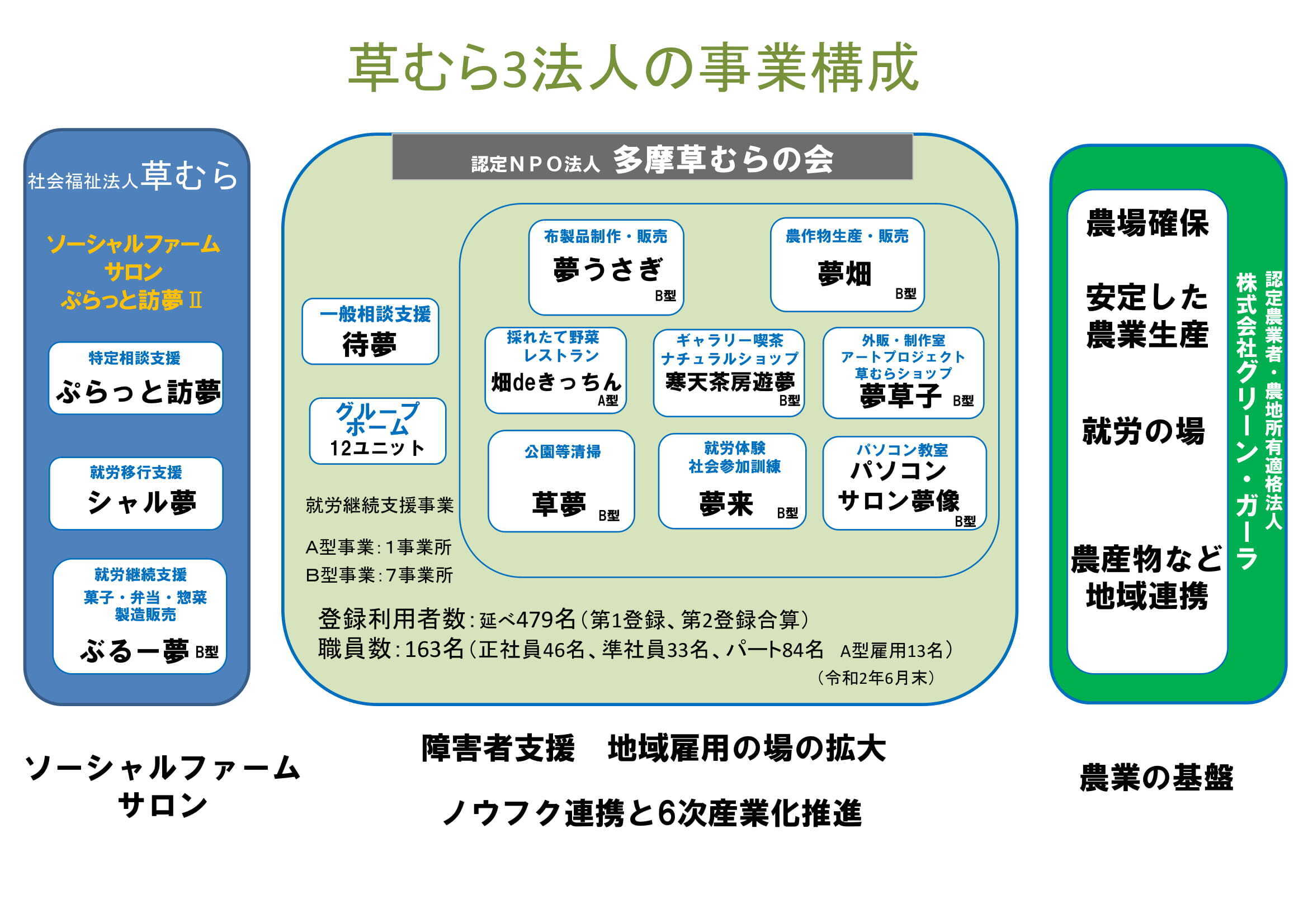 私たち多摩草むらの会は数々の事業所、株式会社、社会福祉法人を立ち上げ、現在に至っております。登録人数は480名を数え、その多くが精神障害といわれる方々です。また、特徴としまして、163名のスタッフのうち、約3分の1が高齢者、ボーダーといわれる方々等、いわゆる就労困難者と呼ばれる方が多いです。当事者の方においては、資格をとったりスキルアップすることにより、一般就労もありますが、当事業所でのパート社員、正社員への選択肢もあります。