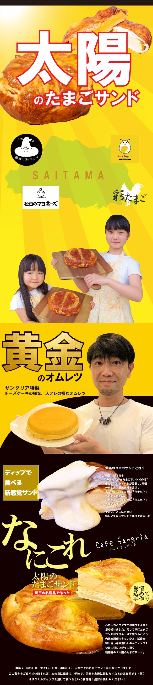 直径20cmの究極のたまごサンド“太陽のたまごサンド”が出来上がりました!現在はさいたま市のお店でしか販売を行っておりませんが、この埼玉の新名物を日本全国の皆様にお届けする為、ぜひご協力・ご支援をお願い致します‼