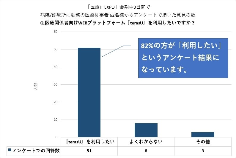 3日間の会期中、当ブースにお越し頂いた全209名のうち、アンケートに回答して頂いた病院/診療所の職員様62名の回答結果は下記グラフのとおりです。
