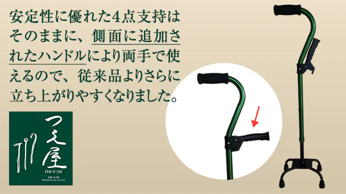 ・「立ち上がり杖」は側面のハンドルと安定性に優れた4点支持で従来品より立ち上がりがしやすいです。