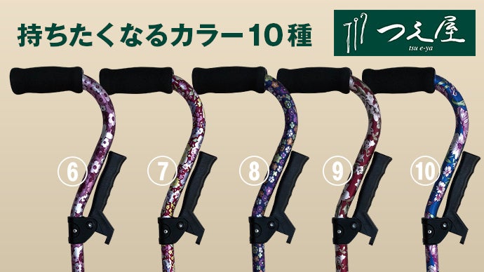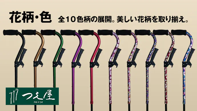 ・「立ち上がり杖」は美しい花柄など10色柄を取り揃え。色彩豊かな杖はお部屋に映えます。