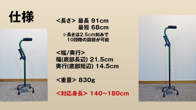 「立ち上がり杖」は、身長140cmから対応しております。