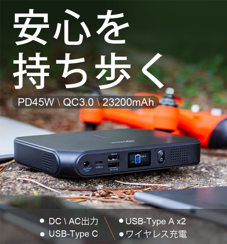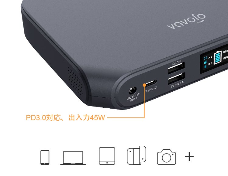「vavofo」は1日使っても安心の大容量バッテリーに従来のモバイルバッテリーではカバーしきれなかったカメラ撮影用品やノートPCの充電にまで対応した本格仕様となっています。電池残量への不安を吹き飛ばし、あなたの充実した1日を最大限にサポートします。