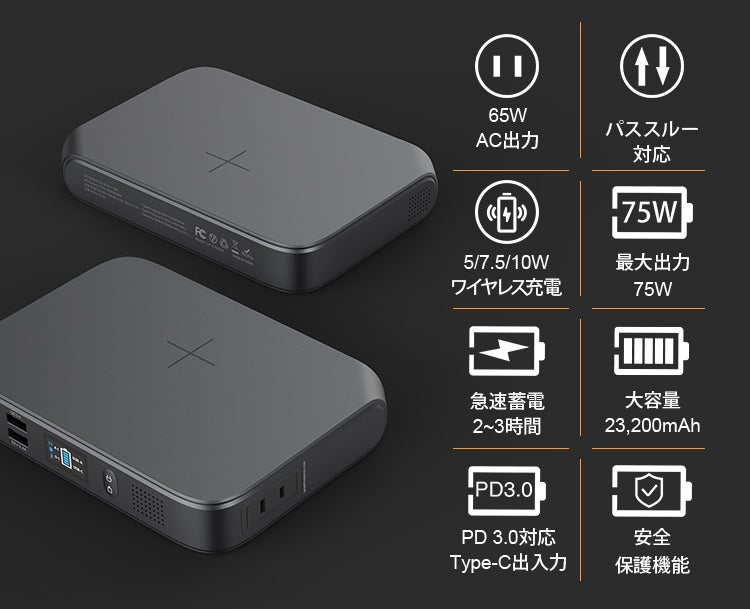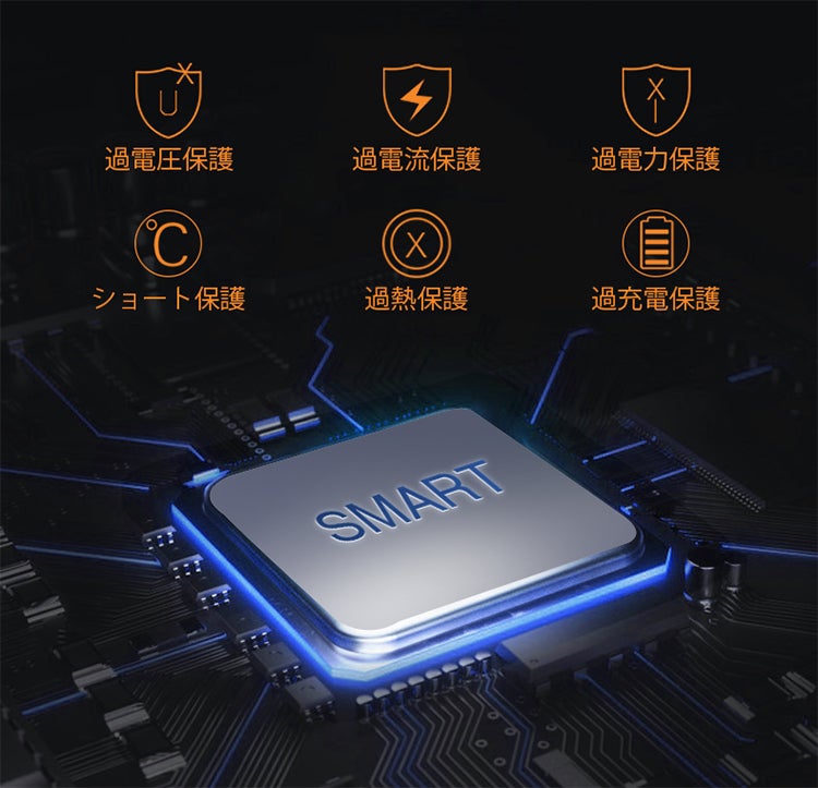 過電流保護・過電圧保護・ショート保護・過熱保護・過電力保護・過充電保護の6つの多重保護設計がされていますので、安全してお使いいただけます。