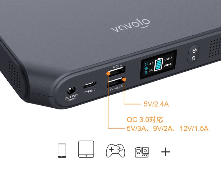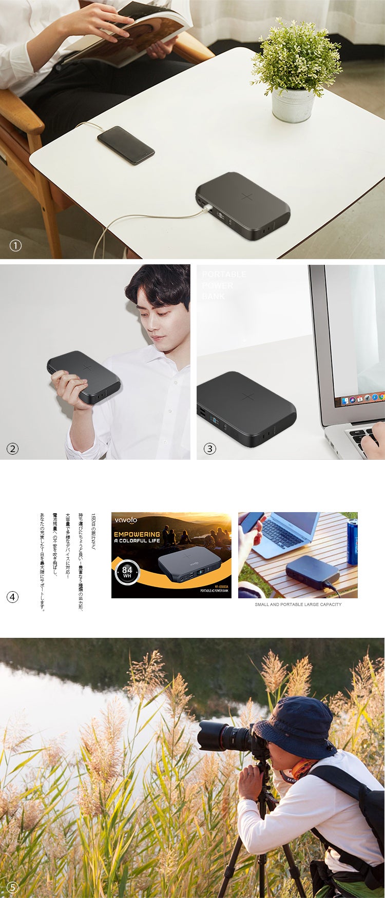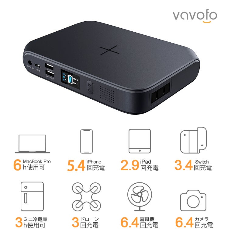 大容量23,200mAhの「vavofo」はご覧のようにお持ちのデバイスを充電するのに十分な容量を兼ね備えています。これだけあれば2.3日の出張や旅行でも十分に使って頂けますよ。