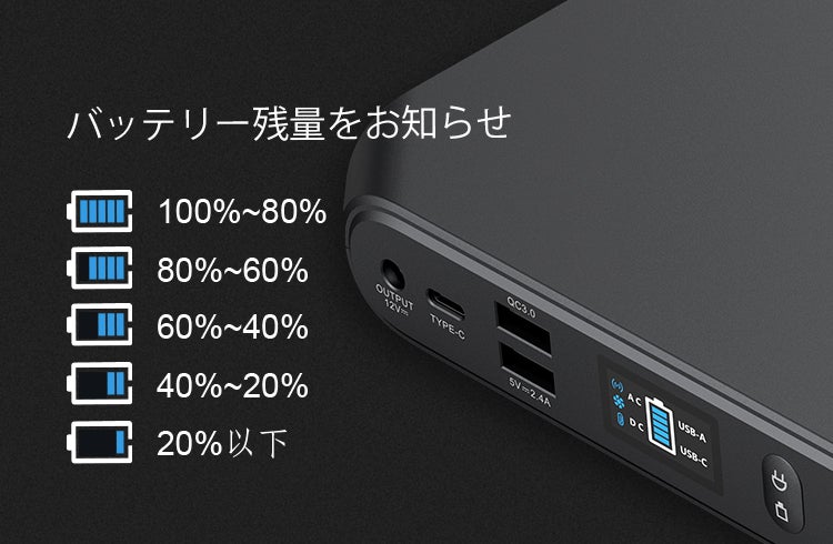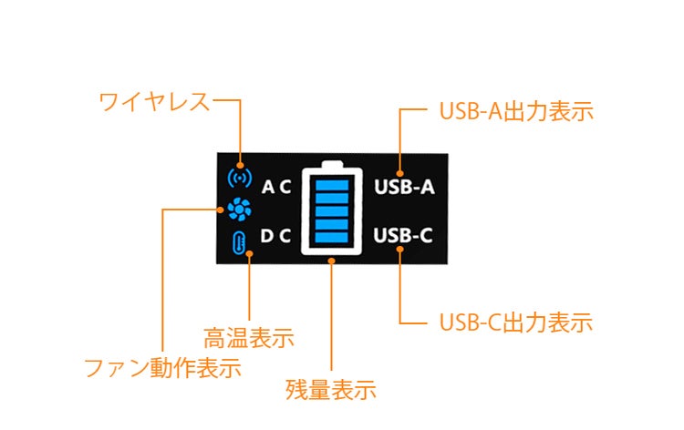A:液晶ディスプレイでバッテリー残量、充放電状況などご確認頂けます。