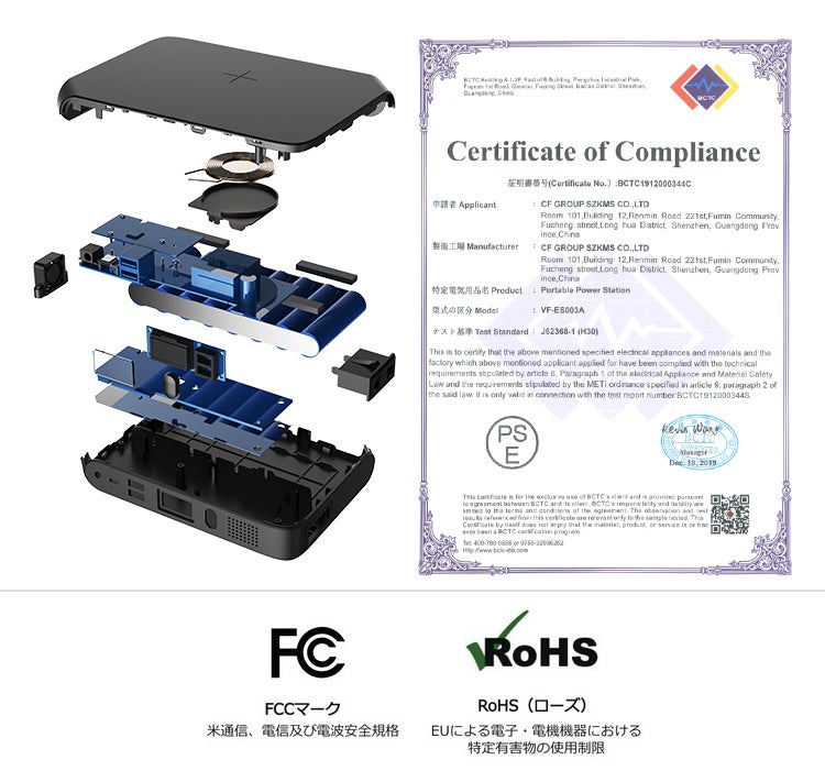 モバイルバッテリーに必須の日本国内の電気用品安全法の技術基準(PSE)も取得済みです。さらに、FCC(米国連邦通信認証)、RoHS(欧州規制)など国際的な認証も取得済みですので、安心してお使いいただけます。