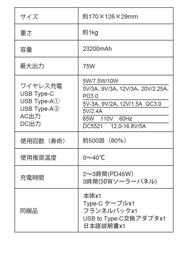 A: 本製品はAC充電アダプターを付属しません。別途ご用意ください。また、ソーラーパワー充電を利用する場合はソーラーパネルを別途ご用意ください。