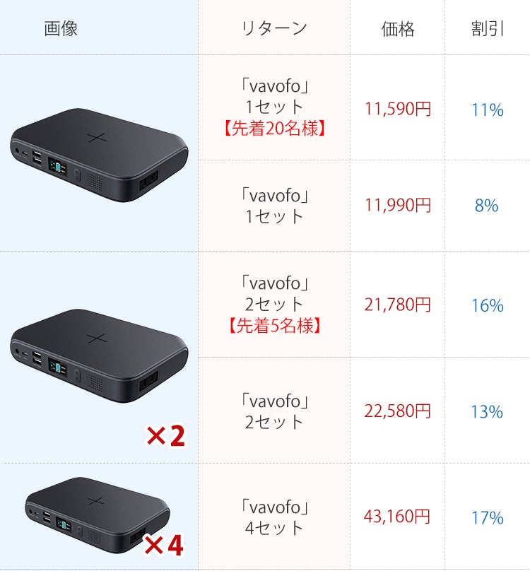 2021/01/14 09:17この度はポータブルバッテリー「vavofo」へたくさんのご支援頂きまして誠にありがとうございます。無事目標金額を達成しプロジェクトを終了することが出来ました。商品の到着まで今しばらくお時間をいただきますが楽しみにしてお待ちくださいませ。 もっと見る【御礼】プロジェクト終了!