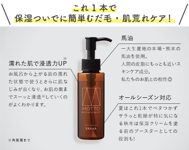 ⇒【MOTTO】に配合されている「馬油」は角質層まで浸透し、お肌の中で保湿をするので、しっとりさらさら肌を長時間キープ。