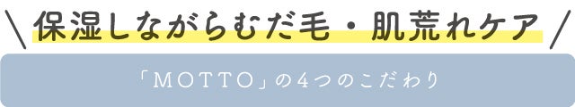 【MOTTO】は濡れた肌に馴染ませて使うことで、浸透力※がさらにUPする成分を使用。お風呂でのご使用をおすすめしております。うっかり塗り忘れを防いで毎日継続してお手入れできるだけでなく、お風呂の中でも使用できるので誰からの目も気にせずむだ毛・肌荒れケアと保湿が可能です。お風呂タイムの新ルーティーンに。