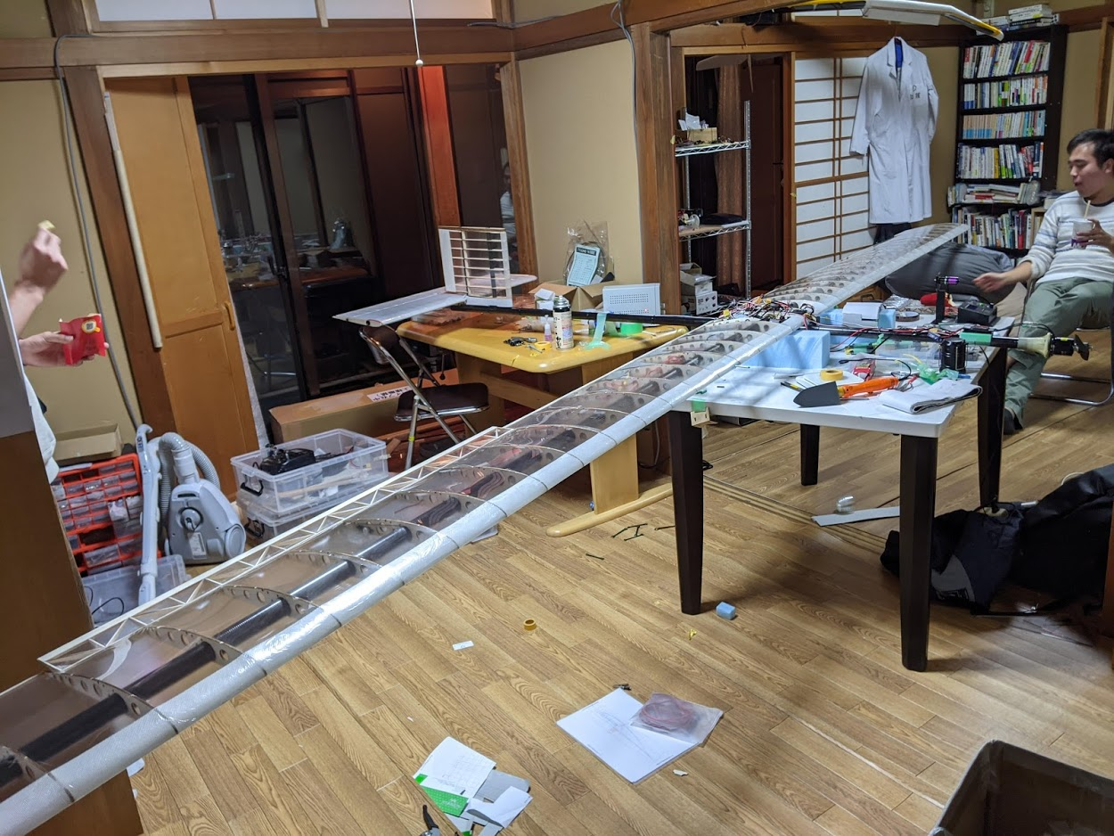 おかげさまで、支援額は目標の約40%を達成し、メンバー一同驚き、歓喜、安堵、様々な反応を示しています。「こんな趣味全開なチャレンジを応援していただけるのか」と懐疑的な思いを抱いておりましたが、支援いただいた皆様からの叱咤激励のお言葉すべて読ませていただいております。本当にありがとうございます。さて、プロジェクトの進行状況について、数パートに分けてお伝えしていこうと思います。お付き合いいただけると励みになります。まずは、昨年まで遡り…2020年10月の初飛行に至るまでのお話を書いてゆきます。ソーラー飛行機の24時間フライトを達成するには、つまるところバッテリーのエネルギーが夜を超えた時点で0になっていなければ良いわけです。下のグラフは午前8時スタートで、24時間での電力状況を示しています(あくまで開発時の試算の段階です)。赤い線Eがバッテリーの持つエネルギーを示しており、これが夜を超えた時点でオレンジのE_bat_criticalを下回っていなければ、24時間飛行達成めでたしと相成ります。ただし、この計算には様々な仮定を含みます。例えば、青い線のPsolarは、ソーラーパネルの発電効率と機体に搭載する枚数、天候や季節、緯度などで決まります。次に緑のPoutは、機体の空力性能(空気抵抗)、プロペラとモータで決まる推進効率、その他機体に搭載しているアビオニクスの電力消費などすべてが加味され決定されます。机上検討では物理的に24時間飛行を達成する解を出すことはできますが、問題はもっと根本的な「ちゃんとした性能の飛行機を自分たちで作り上げなければならない」という点にあります。したがって、必要な初期データ取りを行うために「まずは飛ばす」というフェーズをクリアすることを、試作初号機に取り組む目的としました。空力デザインや構造は類似の他機を参考に決定し、とにかく製作スピードと自身らのスキル向上に努めました。 機体のメイン構造はCFRPの1本桁に、翼のリブやスキンを張り巡らせていく構造です。桁の強度試験を実施し、6G(機体重量の6倍の重さ)にも耐えることを確認しました。主翼の形を作るリブはレーザーカットにより自作しました。仕事を終えた後コツコツと機体をくみ上げていきました。仕事で帰りが遅くなるメンバーもいます。それでも色々な人たちが協力しなければ、期限までに物を作り終えることはできません。構造案など頭の中にあることは、他の人にも伝わる形で残してLINEやらのツールを用いてコミュニケーションをとります。「決めた日程までに作業を終えられるよう工夫していきましょう~」と、時に厳しい言葉をかけ合いつつ今日もまた尾翼が完成してゆきます。最近はホビー向けの安価なプロペラやバッテリー、計測機器類が手に入るため、使えるものはどんどん使って推力計測など、性能同定も行います。そんなこんなで製作を進めてゆき、ついに試作機“S-X”が完成しました!機体完成間近となれば大詰めできつい生活が続きましたが、それでも機体が飛ぶ姿は見たい。準備を進めて飛行試験までこぎつけました。お世話になっているラジコンクラブの飛行場を使わせていただきました。いつもありがとうございます。S-Xを使って、機体の安定した飛行、操縦性を確認することができました。また、チャレンジ当日、夜通し人間が操縦するのも難しいため、自動飛行(オートパイロット)に向けた制御ゲインのチューニングやミッションの確認を行うこともできました。しかし、S-Xは24時間飛行を達成するために設計されたものではないため、空力性能やプロペラ、モータの選定に課題があります。したがって、S-Xの飛行試験を通じて、バッテリーやモータの性能値の同定を進めつつ、次の機体設計にてやるべきことを確定させていきます。