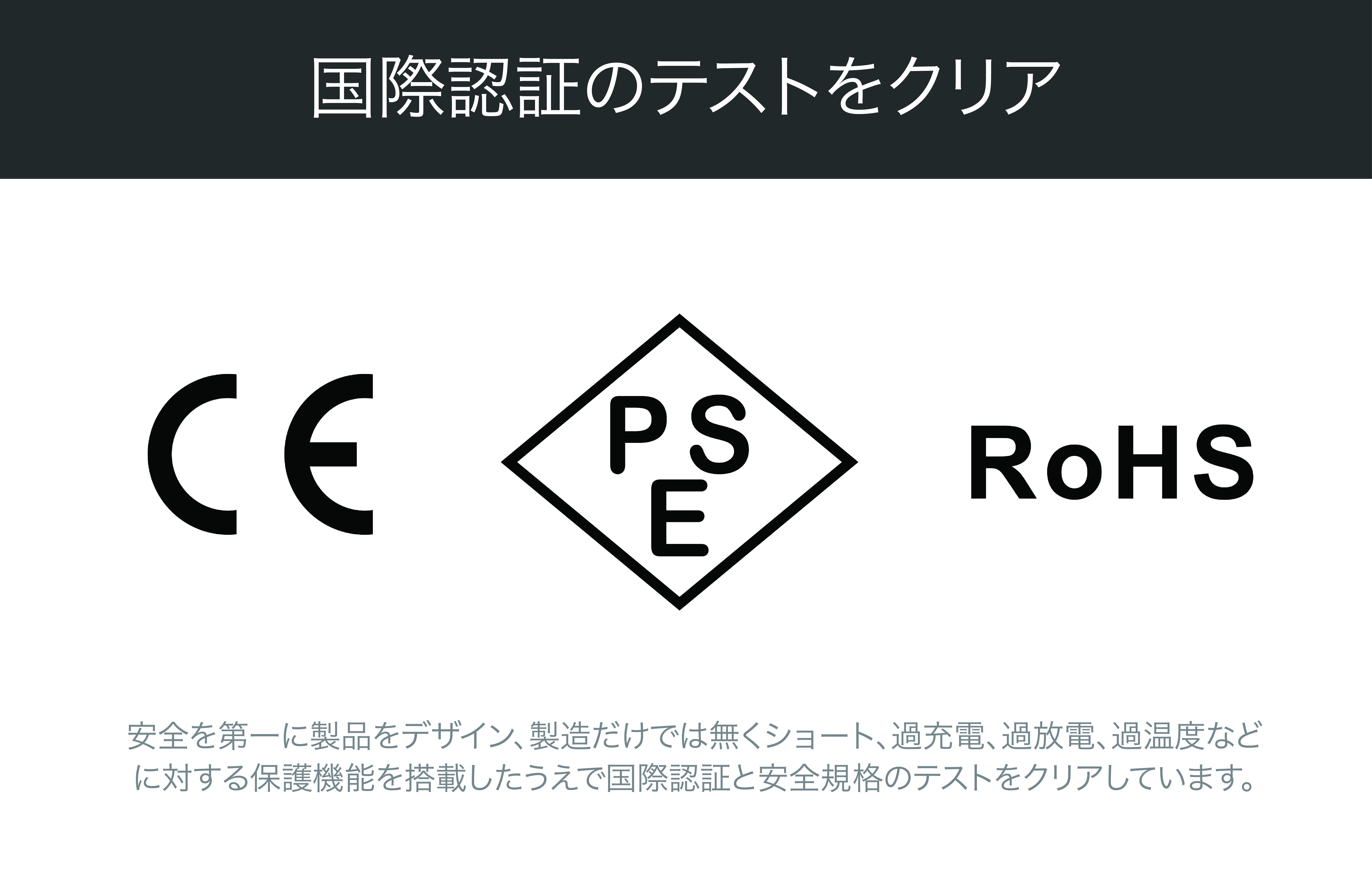 近年、日本では安全の為パワーバンクなどに使われるリチウムイオン電池には日本独自の電機用品安全法のPSE認証マークがついており、ついていないに電化製品の輸入に対する規制厳しくなっています。Liberty Portable Power Bank は国内のPSE認証はもちろん、CEやRoHSなどの海外のテストもクリアしています。