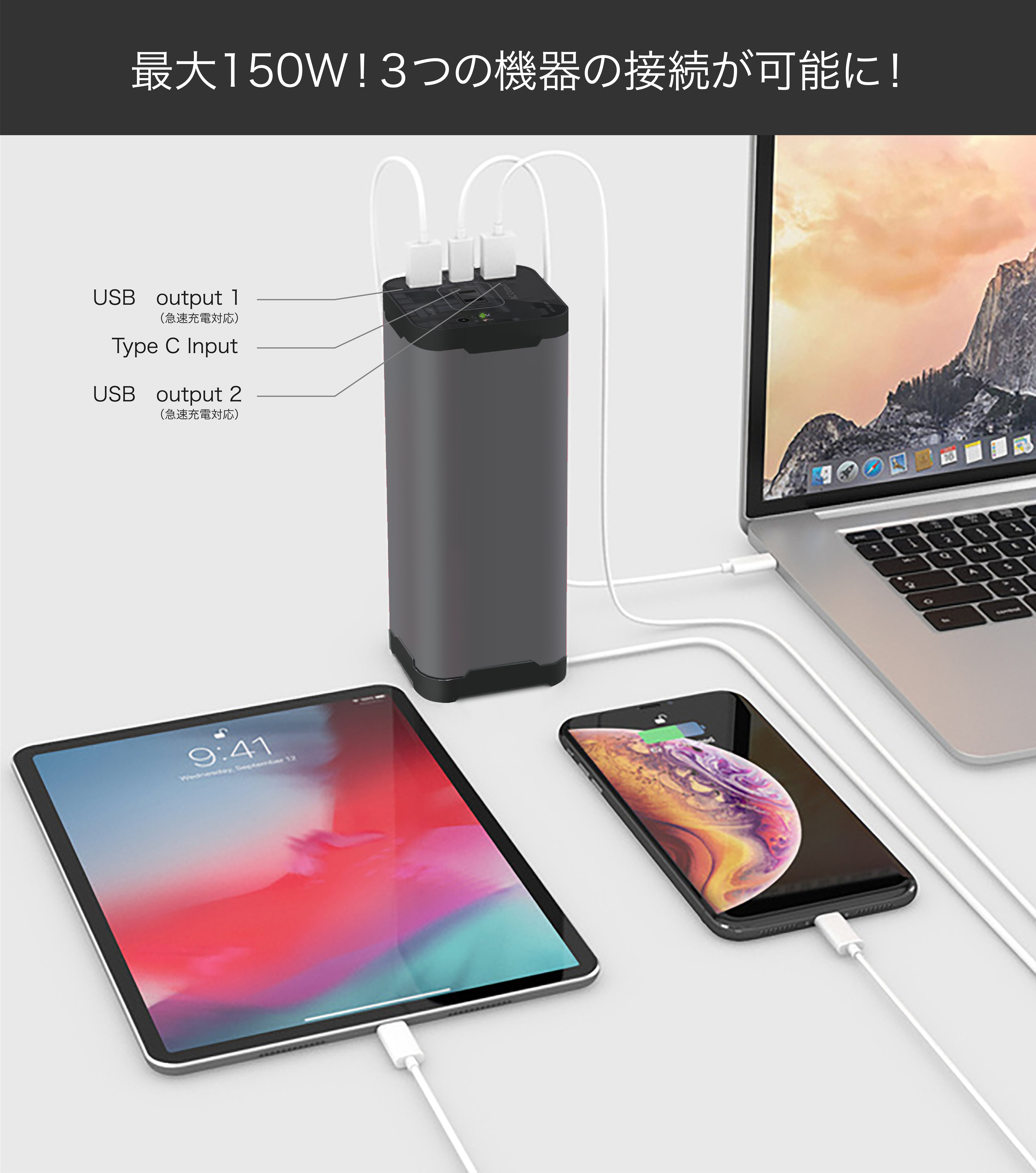 ■出力:本体はUSB,タイプCのみならずACアウトプットも接続が可能!出力数150Wが実現させた機能性です!