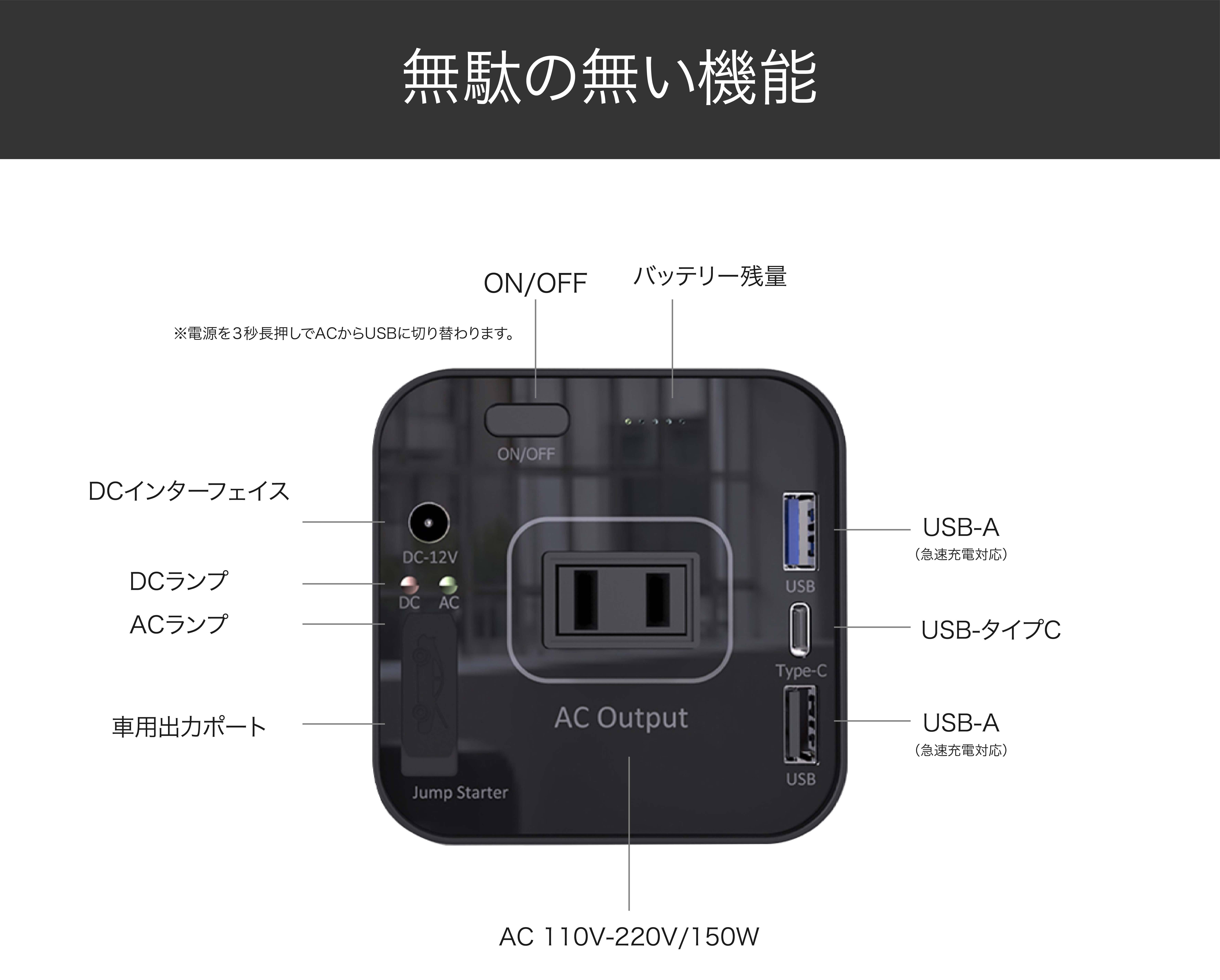 ※ACアウトプットとUSBの同時接続は故障の原因になりかねますのでお控え下さい。電源を3秒長押ししてACモードからUSBモードへ切り替えられます。