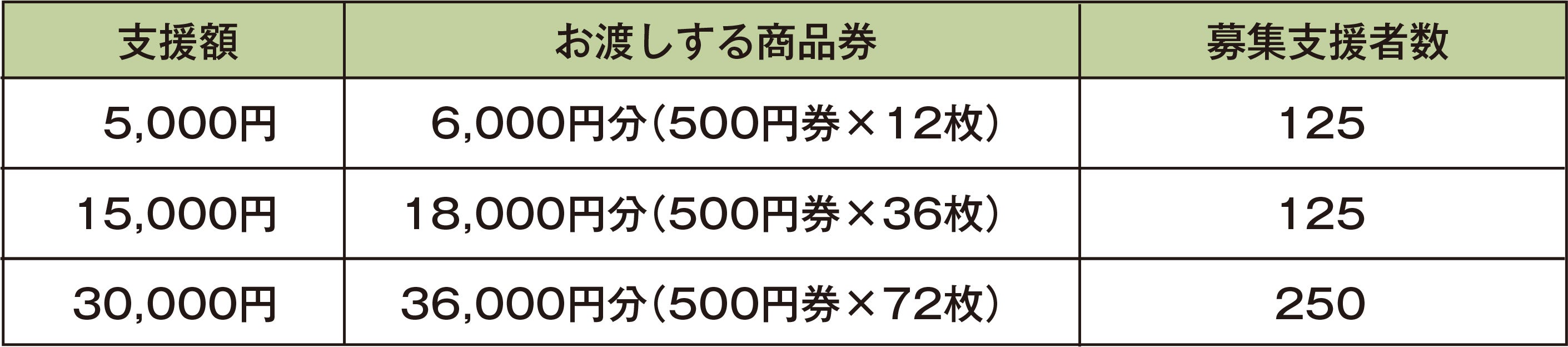 リターンの商品券はプレミアム付。例えば5,000円のコースなら6,000円分の商品券が受け取れます。支援金額は5,000円・15,000円・30,000円の3コースをご用意しています。