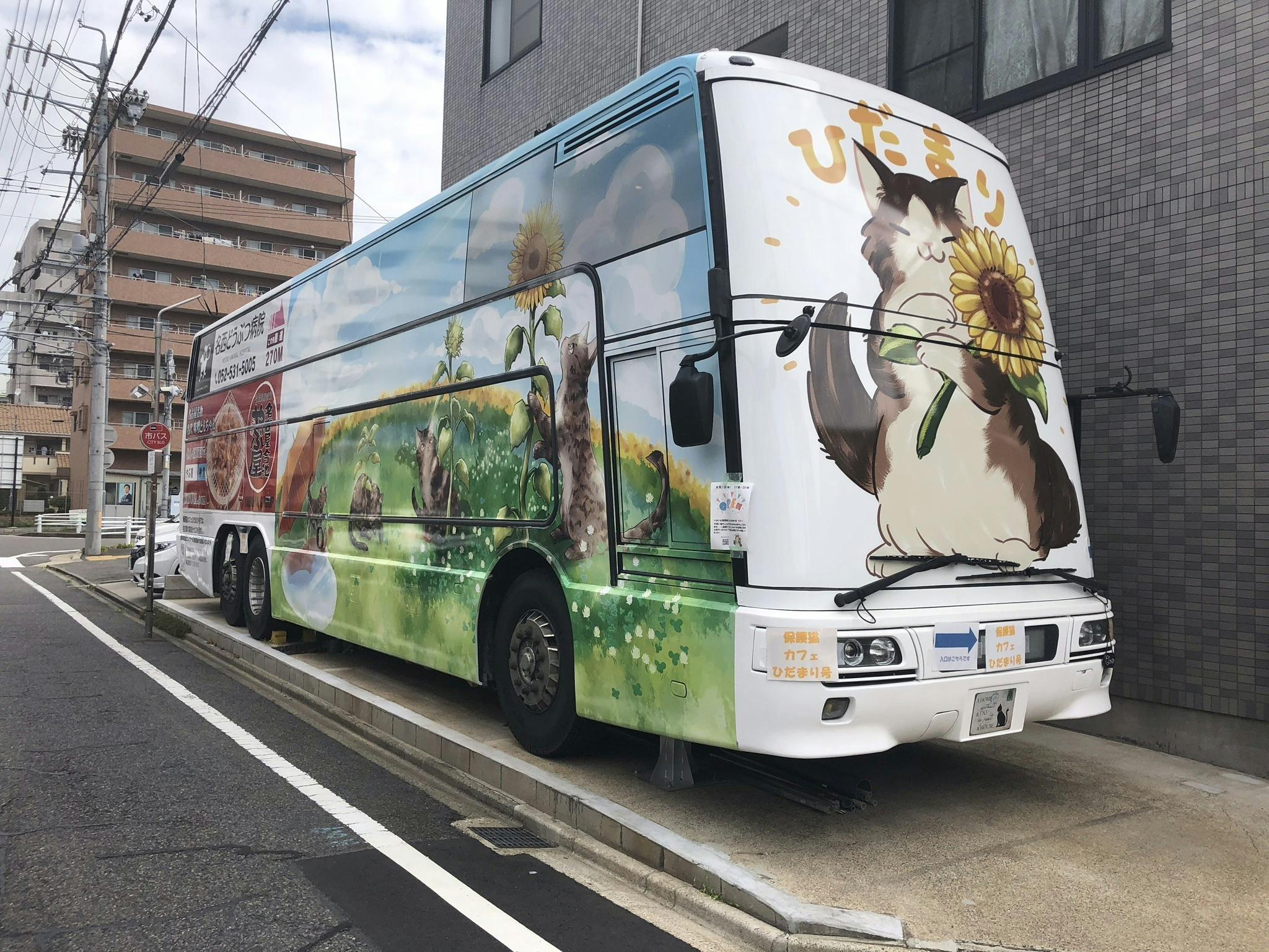 住宅街の中!市バスのバス停の前に大きな2階建てバス!バスには可愛い猫のイラストが!ここは何⁉︎と思われる方も多くいらっしゃるでしょう。