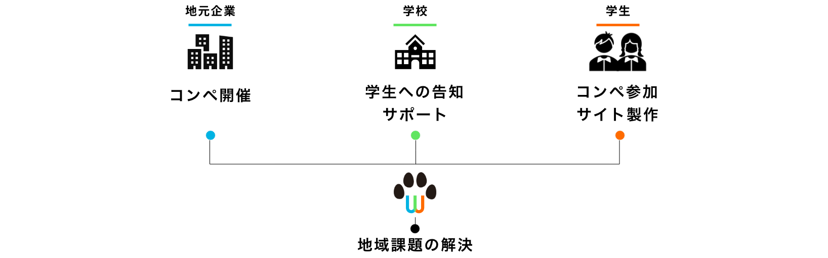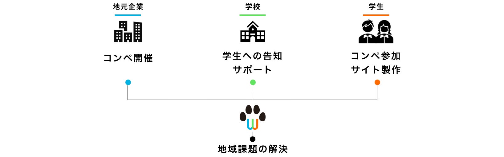 私たちWeb-DOG実行委員会は地元企業と協力してコンペを開催し、地元の学生が実際の制作までを行い地域課題の解決を目指します。