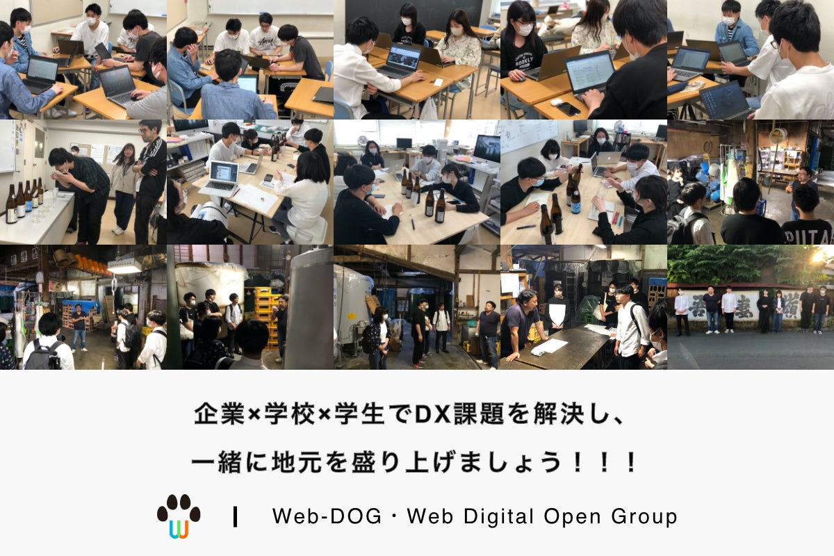 私たち「Web-DOG|Web Digital Open Group」は各地域における様々な課題に対して、地元学生が取り組み/解決することが出来る力を育成し、地域におけるDX(デジタルトランスフォーメーション)を産学連携で推し進めるためのグループです。