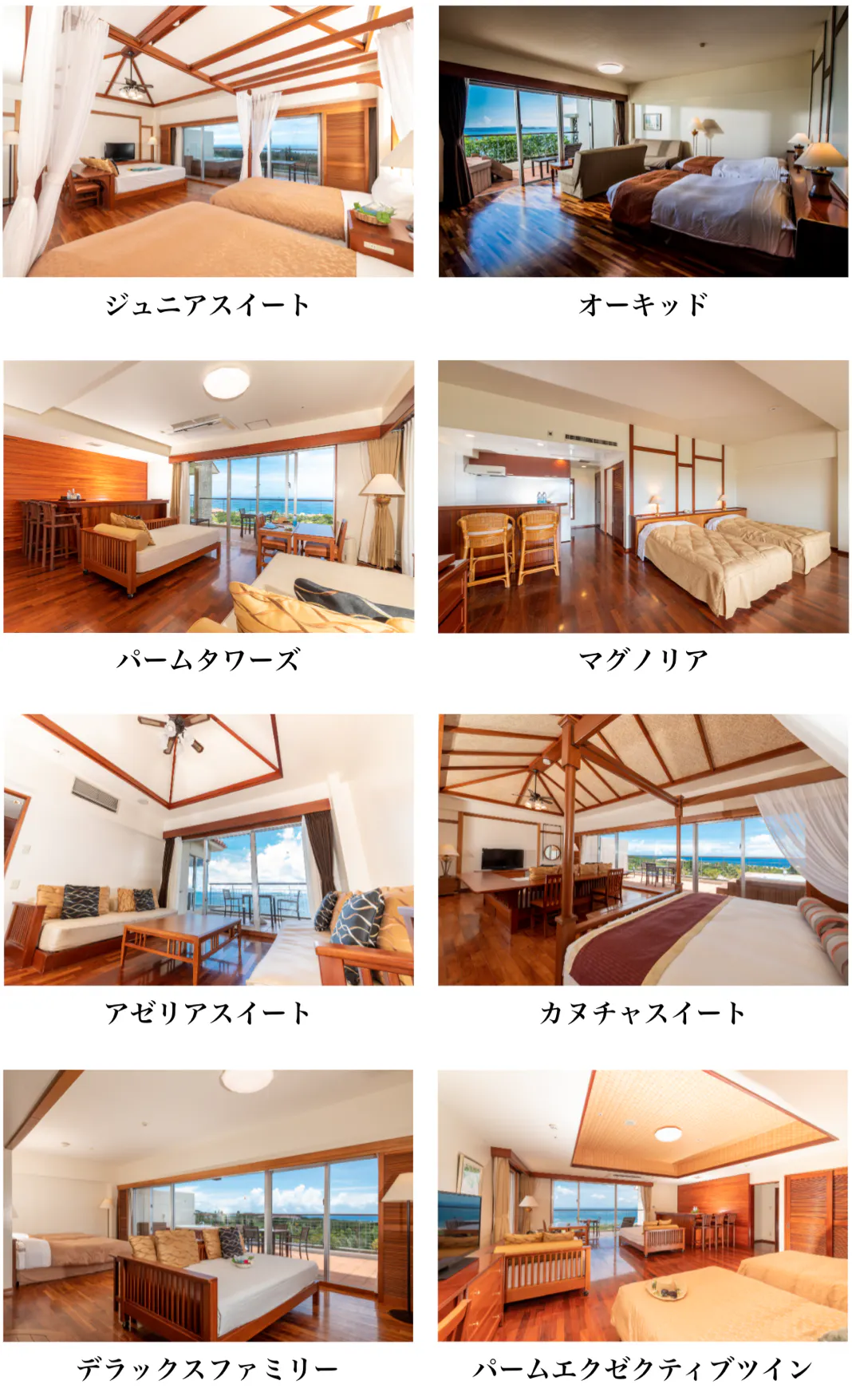 花火観覧チケットとセットでご予約できるカヌチャリゾートの宿泊可能なお部屋の一覧になります。施設・部屋の詳細につきましては、カヌチャリゾート公式ホームページをご覧ください。
