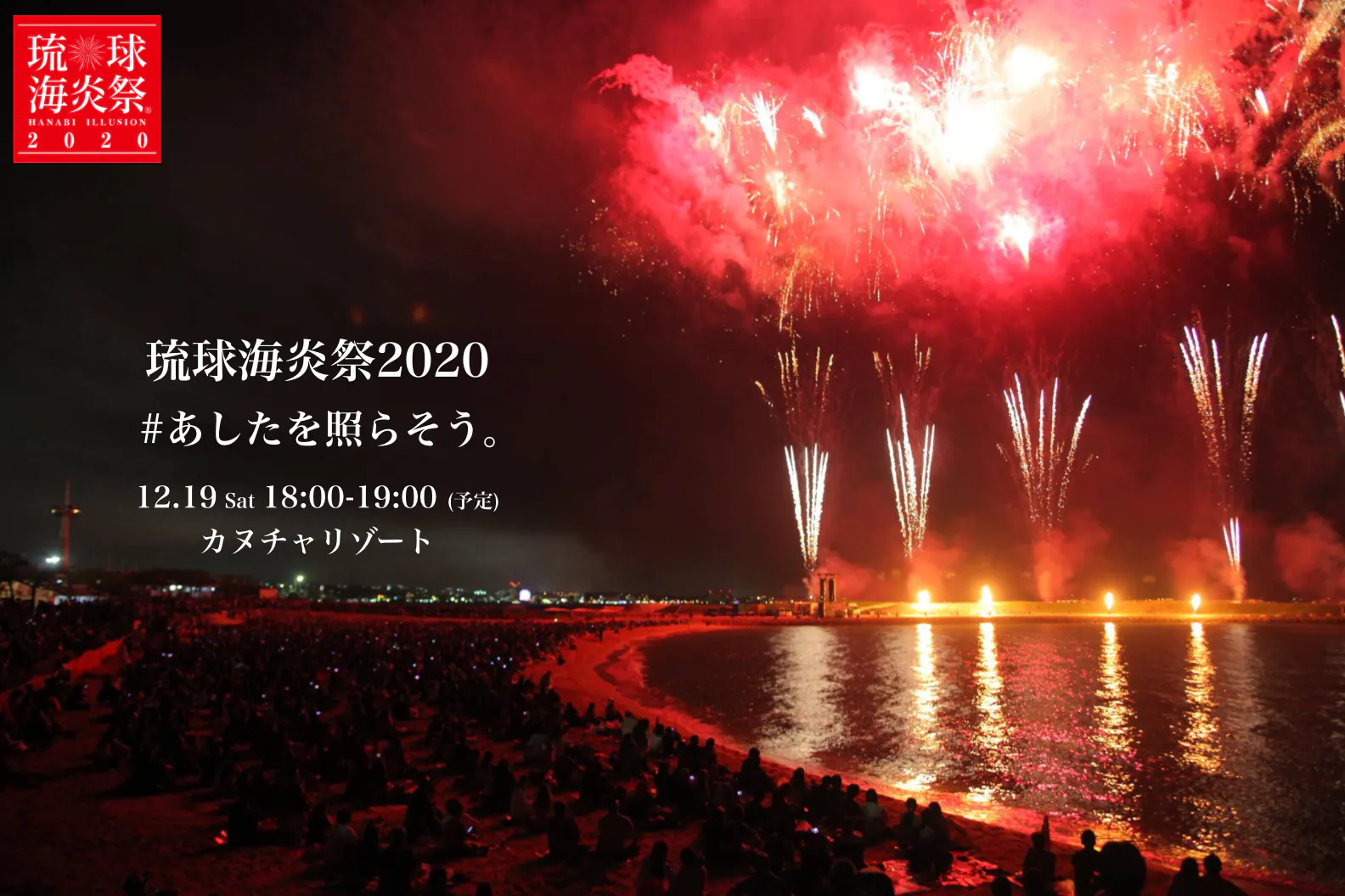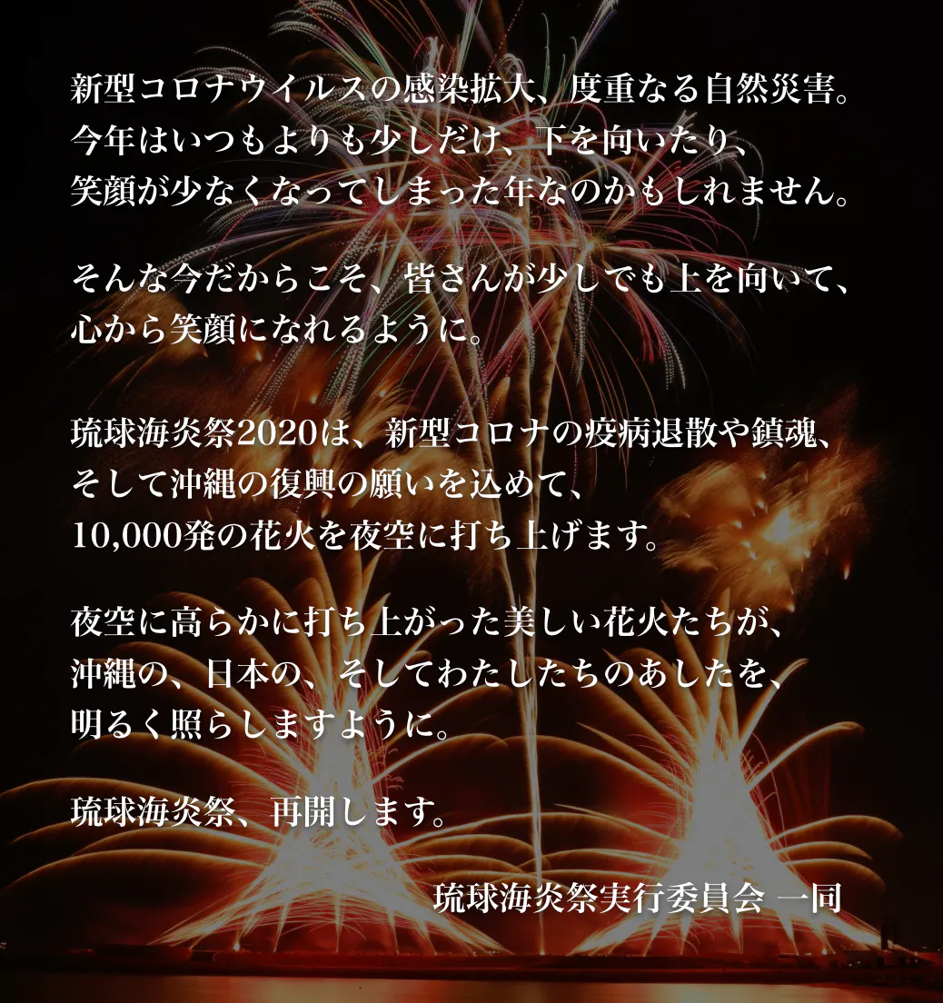 新型コロナウイルスの感染拡大の影響で、今年4月の開催を見送っておりましたが、12月19日に名護市カヌチャリゾート敷地内で、延期開催することが決定いたしました。新型コロナウイルスの疫病退散・犠牲者への慰霊・鎮魂、そして沖縄から多くの方に元気をお届けできるよう、10,000発の花火を打ち上げます。