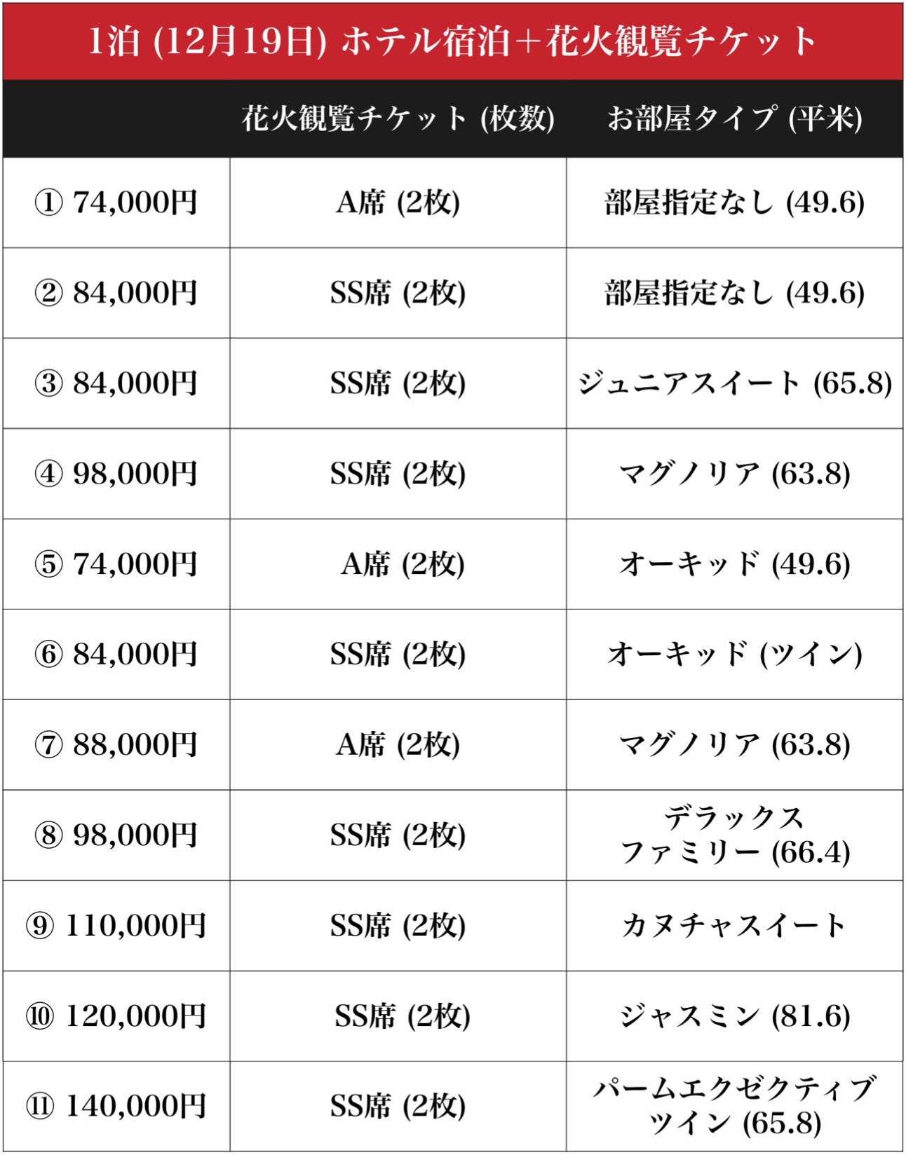 「花火観覧チケット+カヌチャリゾートご宿泊セット」の一覧は以下の通りです。