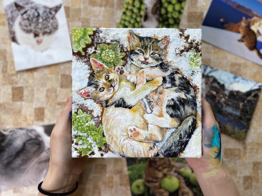 背景に、日本画特有の絵の具である「方解末」と「胡粉」を使って「日本画×ネコ」を表現しました。