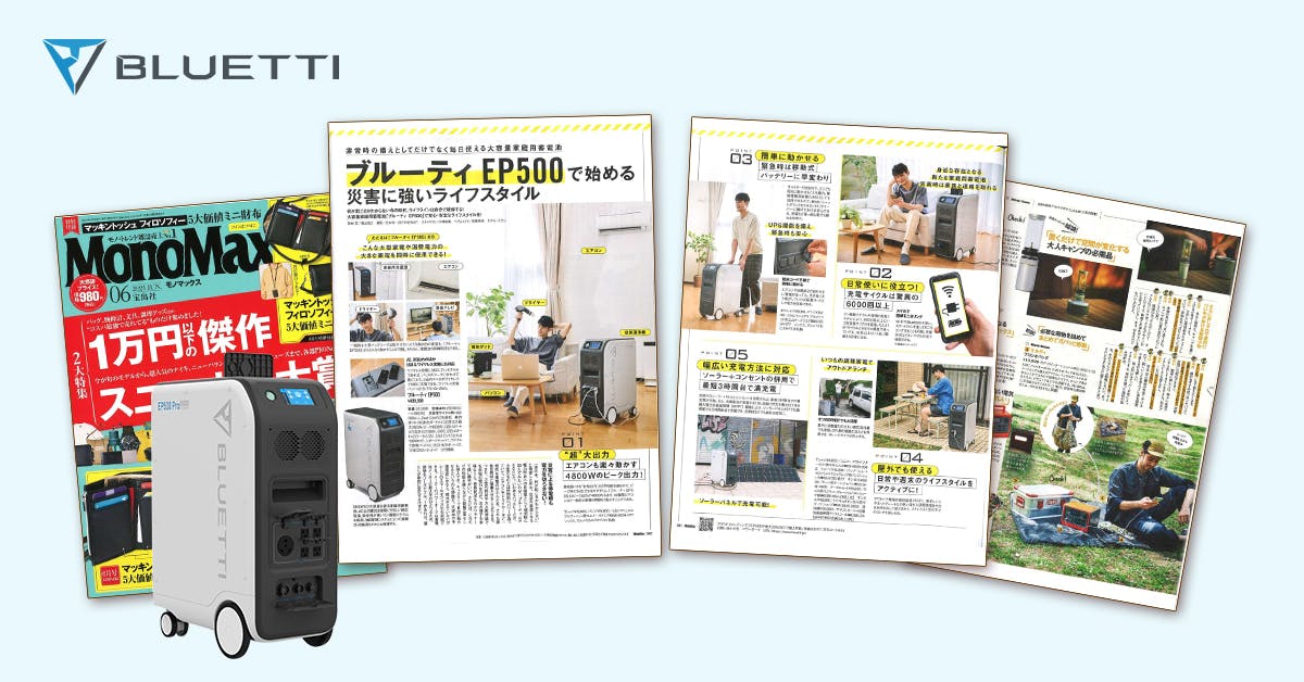 大変光栄なことに「BLUETTI EP500」が5月8日発売『Mono Max』6月号に、注目製品として取り上げて頂きました!「災害に強いライフスタイル」を主題として、BLUETTI EP500のパフォーマンスをご紹介いただいております。